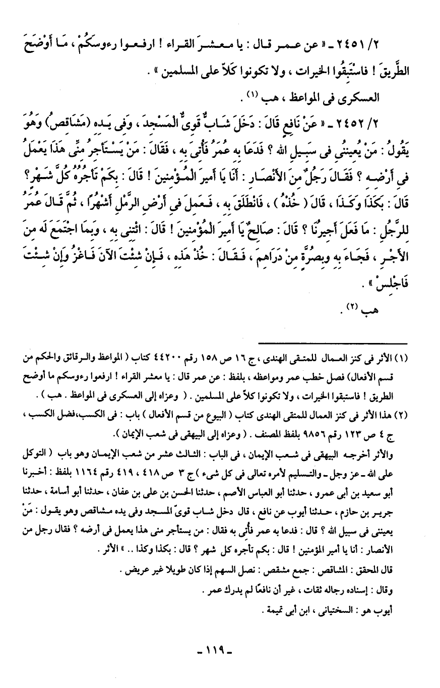 2/ 2451 - "عن عمر قال: يا معشرَ القراء! ارفعوا رءوسَكُمْ، مَا أَوْضَحَ الطَّريقَ! فاسْتَبِقُوا الخيرات، ولا تكونوا كَلَّا على المسلمين".