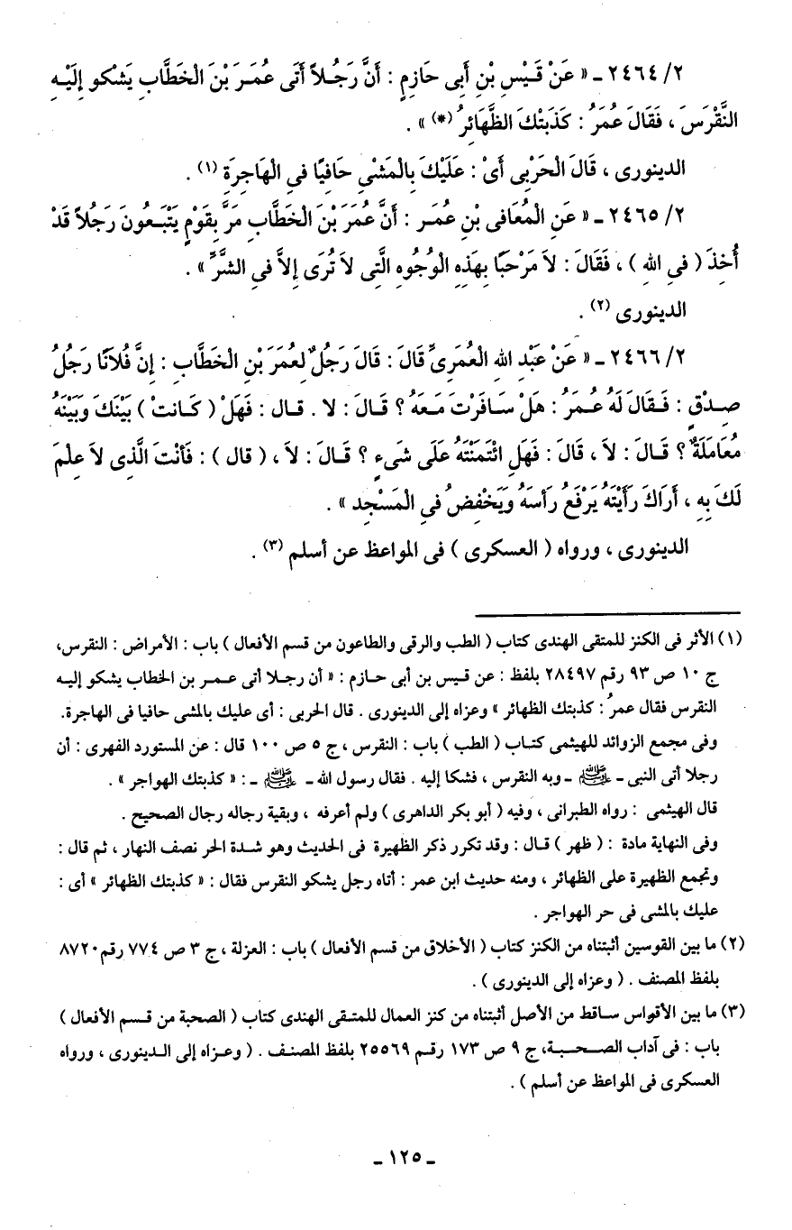 2/ 2464 - "عَنْ قَيْسِ بْنِ أَبِى حَازِمٍ: أَنَّ رَجُلًا أَتَى عُمَرَ بْنَ الْخَطَّابِ يَشْكو إِلَيْهِ النَّقْرَسَ، فَقَالَ عُمَرُ: كَذَبتْكَ الظَّهَائِرُ (*) ".
