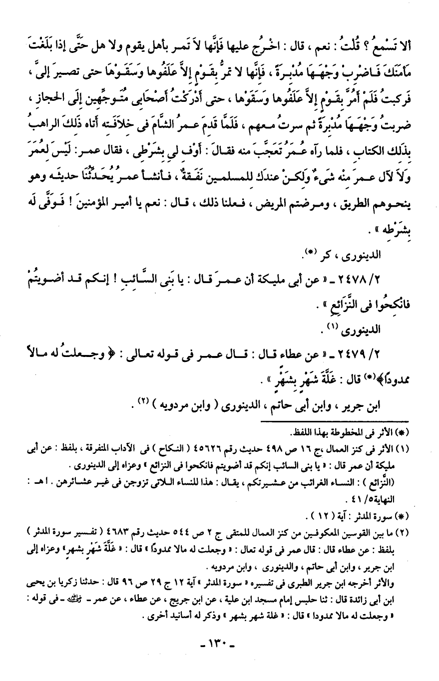 2/ 2479 - "عن عطاءِ قال: قال عمر في قوله تعالى: {وَجَعَلْتُ لَهُ مَالًا مَمْدُودًا} (*) قال: غَلَّةَ شَهْرِ بِشَهْرٍ".