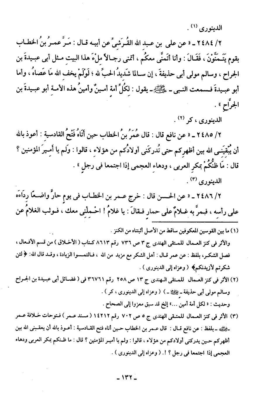 (¬2) الأثر في كنز العمال للمتقى الهندى جـ 13 ص 258 رقم 36761 في (فضائل أَبى عبيدة بن الجراح وسالم مولى أَبى حذيفة -رضي اللَّه عنهما-) (وعزاه إلى الدينورى، كر).