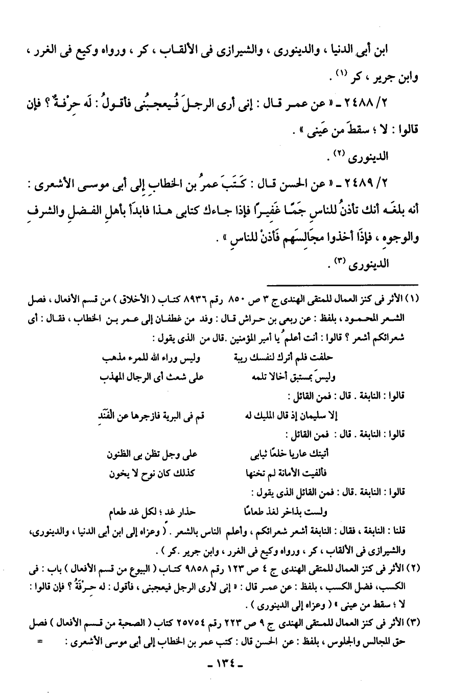 (¬3) الأثر في كنز العمال للمتقى الهندى جـ 9 ص 223 رقم 25754 كتاب (الصحبة من قسم الأفعال) فصل حق المجالس والجلوس، بلفظ: عن الحسن قال: كتب عمر بن الخطاب إلى أَبى موسى الأشعرى: =