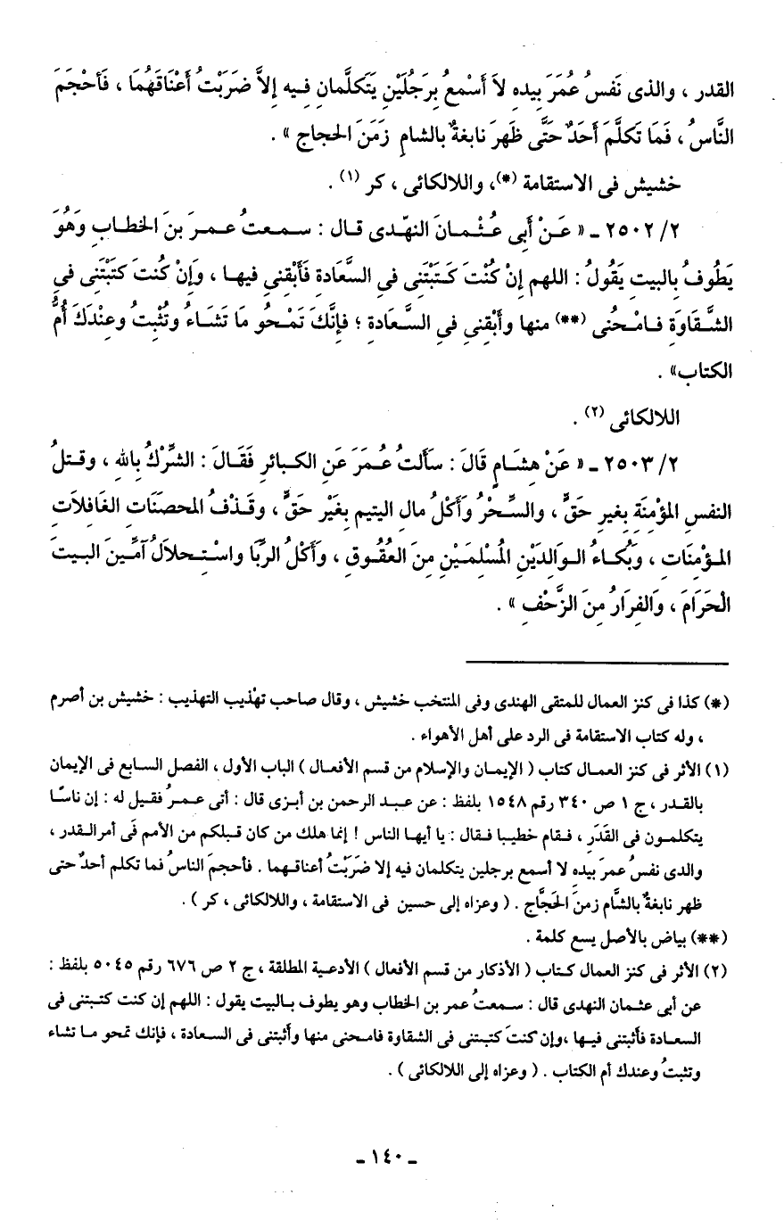 2/ 2502 - "عَنْ أَبِى عُثْمانَ النهدى قال: سمعتُ عمرَ بنَ الخطابِ وَهُوَ يَطُوفُ بِالبيتِ يَقُولُ: اللهم إِنْ كُنْتَ كَتَبْتَنِى في السَّعَادةِ فَأَبْقِنِى فيها، وَإِنْ كُنتَ كتَبْتَنِى في الشَّقَاوَةِ فامْحُنى (* *) منها وأَبْقِنىِ في السَّعَادةِ؛ فإِنَّكَ تَمْحُو مَا تَشَاءُ وتُثْبِتُ وعِنْدَكَ أُمُّ الكتاب".