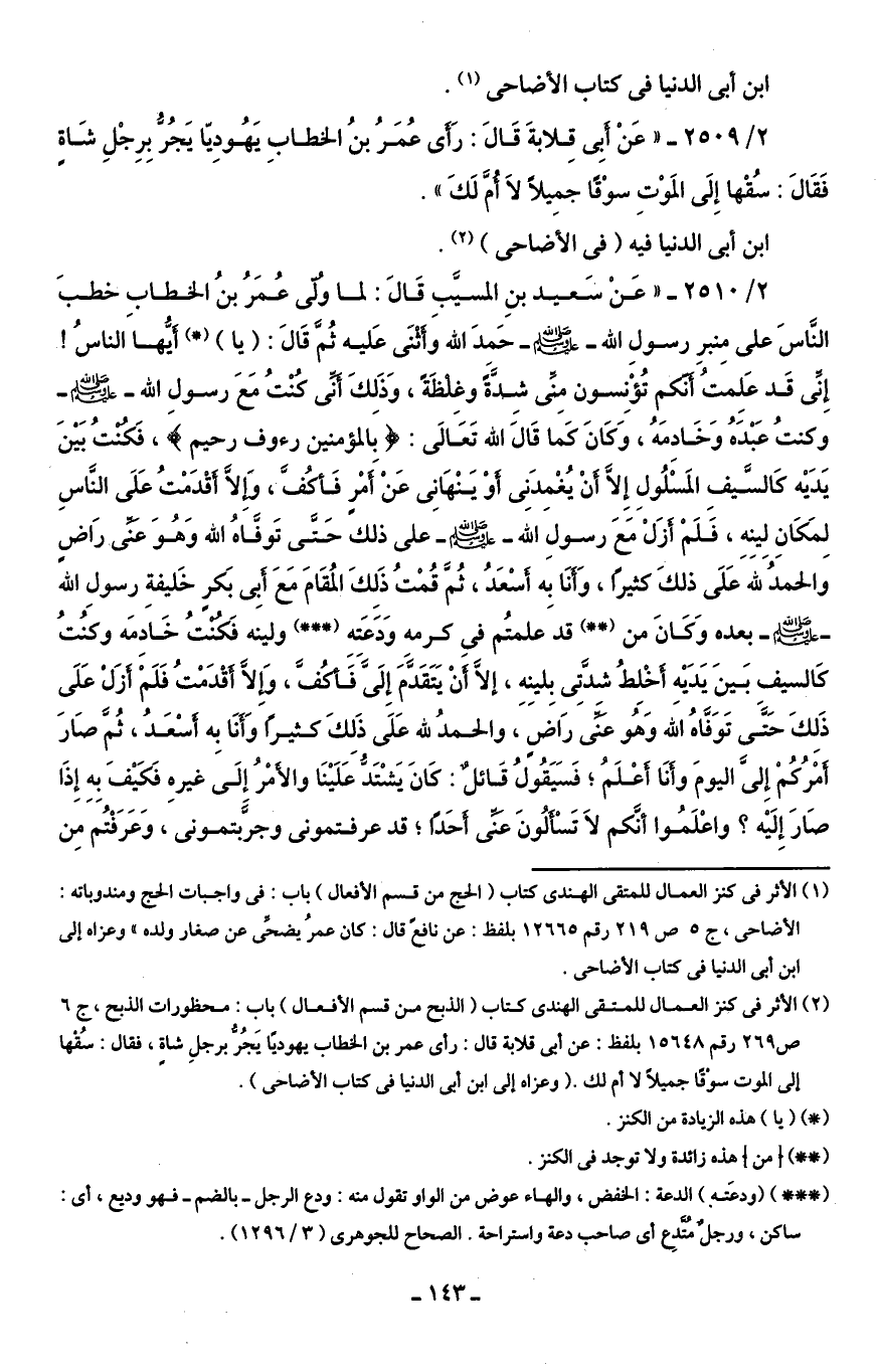 (¬2) الأثر في كنز العمال للمتقى الهندى كتاب (الذبح من قسم الأفعال) باب: محظورات الذبح، جـ 6 ص 269 رقم 15648 بلفظ: عن أَبى قلابة قال: رأى عمر بن الخطاب يهوديًا يَجُرُّ برجلِ شاةٍ، فقال: سُقْها إلى الموت سوْقًا جميلًا لا أم لك. (وعزاه إلى ابن أَبى الدنيا في كتاب الأضاحى).