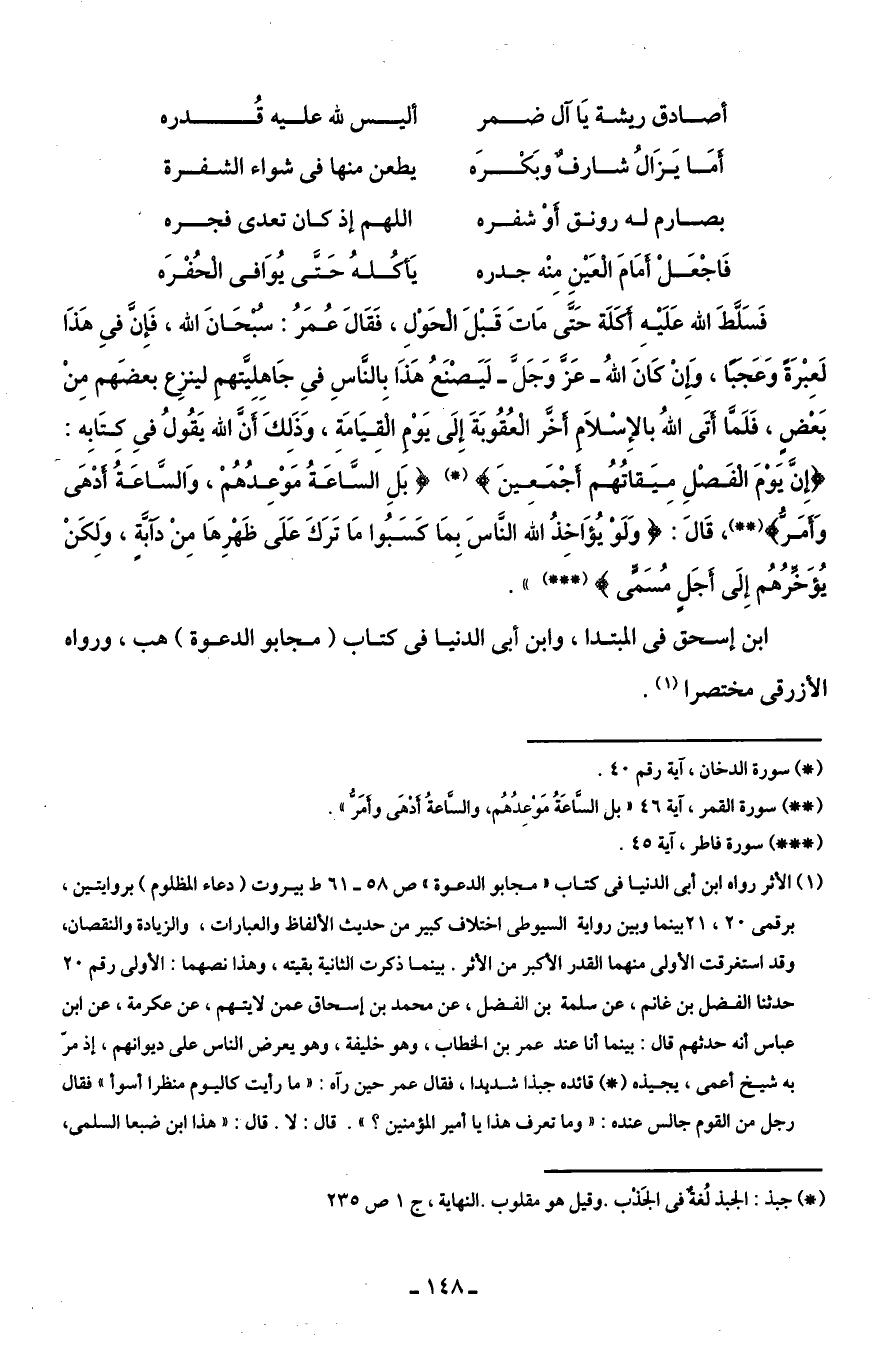 فَسَلَّطَ اللَّه عَلَيْهِ أَكَلَة حَتَّىِ مَاتَ قَبْلَ الْحَوْلِ، فَقَالَ عُمَرُ: سُبْحَانَ اللَّه، فَإِنَّ في هَذَا لَعِبْرَةً وَعَجَبًا، وإِنْ كَانَ اللَّهُ -عَزَّ وَجَلَّ- لَيَصْنَعُ هَذَا بِالنَّاسِ في جَاهِليَّتهم لينزِع بعضَهم مِنْ بَعْضٍ، فَلَمَّا أَتَى اللَّهُ بالإِسْلَامِ أَخَّر الْعُقُوبَةَ إِلَى يَوْمِ الْقِيَامَةِ، وَذَلِكَ أَنَّ اللَّه يَقُولُ في كِتَابِه: {إِنَّ يَوْمَ الْفَصْلِ مِيقَاتُهُمْ أَجْمَعِينَ} (*) {بَلِ السَّاعَةُ مَوْعِدُهُمْ وَالسَّاعَةُ أَدْهَى وَأَمَرُّ} (* *)، قَالَ: {وَلَوْ يُؤَاخِذُ اللَّهُ النَّاسَ بِمَا كَسَبُوا مَا تَرَكَ عَلَى ظَهْرِهَا مِنْ دَابَّةٍ وَلَكِنْ يُؤَخِّرُهُمْ إِلَى أَجَلٍ مُسَمًّى} (* * *) ".