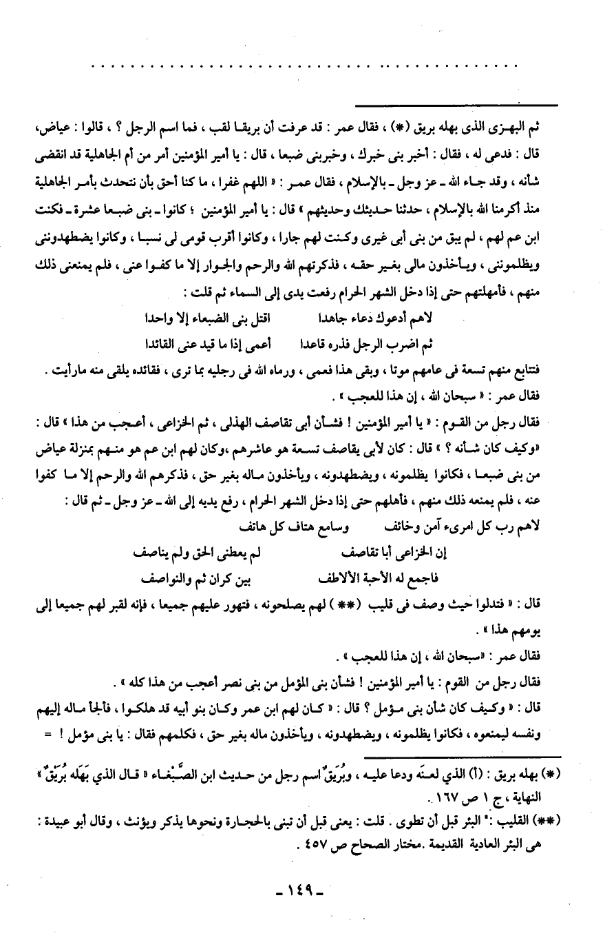 = ثم البهزى الذى بهله بريق (*)، فقال عمر: قد عرفت أن بريقا لقب، فما اسم الرجل؟ ، قالوا: عياض، قال: فدعى له، فقال: أخبر بنى خبرك، وخبر بنى ضبعا، قال: يا أمير المؤمنين أمر من أم الجاهلية قد انقضى شأنه، وقد جاء اللَّه -عز وجل- بالإسلام، فقال عمر: "اللهم غفرا، ما كنا أحق بأن نتحدث بأمر الجاهلية منذ أكرمنا اللَّه بالإسلام، حدثنا حديثك وحديثهم" قال: يا أمير المؤمنين؛ كانوا -بنى ضبعا عشرة- فكنت ابن عم لهم، لم يبق من بنى أَبى غيرى وكنت لهم جارا، وكانوا أقرب قومى لى نسبا, وكانوا يضطهدوننى ويظلموننى، ويأخذون ما لى بغير حقه، فذكرتهم اللَّه والرحم والجوار إلَّا ما كفوا عنى، فلم يمنعنى ذلك منهم، فأمهلتهم حتى إذا دخل الشهر الحرام رفعت يدى إلى السماء ثم قلت: