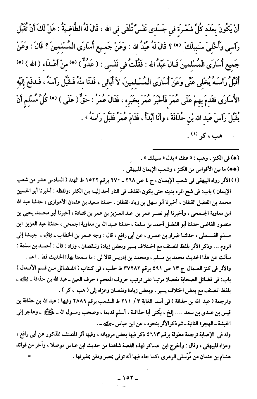 أَنْ يَكُونَ بِعَدَدِ كُلِّ شَعْرَةٍ في جَسَدِى نَفْسٌ تُلْقَى في اللَّه، قَالَ لَهُ الطَّاغِيَةُ: هَلْ لَكَ أَنْ تُقَبِّل رَأسِى وَأُخْلِى سَبِيلَكَ (*)؟ قَالَ لَهُ عُبْدُ اللَّه: وَعَنْ جَمِيع أُسَارَى الْمُسْلِمِينَ؟ قَالَ: وَعَنْ جَمِيع أُسَارَى الْمُسْلِمينَ قَالَ عَبْدُ اللَّه: فَقُلْتُ في نَفْسِى: (عَدُوٌّ) (* *) مِنْ أَعْدَاءِ (اللَّه) (* *) أُقَبِّلُ رَأسَهُ يُخْلِى عَنِّى وَعَنْ أُسَارَى الْمُسْلِمِينَ، لَا أُبَالِى، فَدَنَا مِنْهُ فَقَبَّل رَأسَهُ، فَدفَعَ إِلَيْهِ الأُسَارَى فقَدِمَ بِهِمْ عَلَى عُمَرَ فَأَخْبَرَ عُمَرَ بِخَبَرِهِ، فَقَالَ عُمَرُ: حَقٌّ (عَلَى) (* *) كُلِّ مُسْلِمٍ أَنْ يُقَبِّلَ رَأسَ عَبدِ اللَّه بْنِ حُذَافَةَ، وأَنَا أَبْدَأُ، فَقَامَ عُمَرُ فَقَبَّلَ رَأسَهُ".