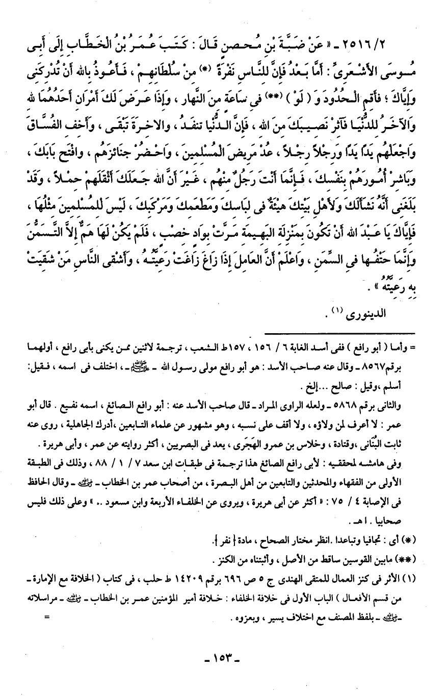 2/ 2516 - "عَنْ ضَبَّةَ بْنِ مُحصنٍ قَالَ: كَتَبَ عُمَرُ بْنُ الْخَطَّابِ إِلَى أَبِى مُوسَى الأَشْعَرِىِّ: أَمَّا بَعْدُ فَإِنَّ للِنَّاسِ نَفْرَةً (*) مِنْ سُلْطَانِهِمْ، فَأَعُوذُ بِاللَّه أَنْ تُدْرِكَنِى وَإِيَّاكَ؛ فأَقِم الْحُدُودَ وَ (لَوْ) (* *) فِى سَاعَة مِنَ النَّهار، وإِذَا عَرَضَ لَكَ أَمْرَانِ أَحَدُهُمَا للَّهِ وَالآخَرُ للدُّنْيَا فَآثِرْ نَصِيبَكَ مِنَ اللَّهِ، فَإِنَّ الدُّنْيا تنفَدُ، والآخِرَةَ تَبْقَى، وَأَخِفِ الفُسَّاقَ وَاجْعَلهُمَ يَدًا يَدًا وَرِجْلًا رِجْلًا، عُدْ مَرِيضَ الْمُسْلِمِينَ، وَاحْضُرْ جنَائزَهُم، وافْتَح بَابَكَ، وَبَاشِرْ أُمُورَهُمْ بِنَفْسكَ، فَإِنَّمَا أَنْتَ رَجُلٌ مِنْهُم، غَيْرَ أَنَّ اللَّه جَعَلَكَ أَثْقَلَهمْ حمْلًا، وَقَدْ بَلَغَنِى أَنَّهُ نَشَأَلَكَ وَلأَهْلِ بَيْتِكَ هيْئَةٌ في لِبَاسِكَ وَمَطْعَمِكَ وَمَرْكَبِكَ، لَيْسَ لْلِمُسْلَمِينَ مثْلُهَا، فَإِيَّاكَ يَا عَبْدَ اللَّه أَنْ تَكُونَ بِمَنْزِلَةِ البَهِيمَةِ مَرَّتْ بِوَادٍ خِصْبٍ، فَلَمْ يَكُنْ لَهَا هَمٌّ إِلَّا التَّسَمُّنَ وَإنَّمَا حَتْفُها في السِّمَنِ، وَاعْلَمْ أَنَّ العَامِلَ إِذَا زَاغَ زَاغَتْ رَعِيَّتُهُ، وَأَشْقى النَّاسِ مَنْ شَقِيَتْ بِهِ رعِيُّتُهُ".