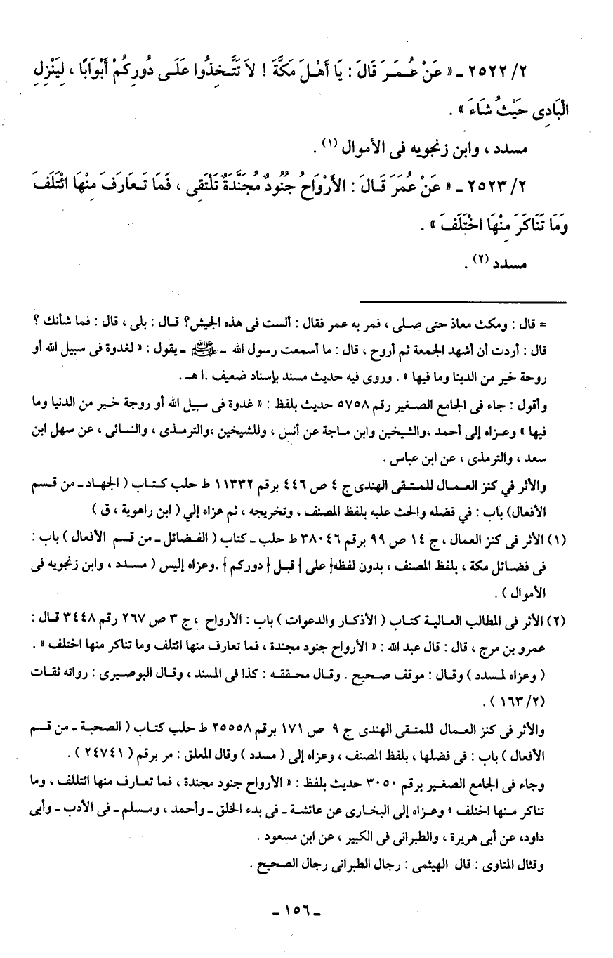 2/ 2523 - "عَنْ عُمَرَ قَالَ: الأَرْوَاحُ جُنُودٌ مُجَنَّدَةٌ تَلْتَقِى، فَمَا تَعَارَفَ مِنْهَا ائْتَلَفَ وَمَا تَنَاكَرَ مِنْهَا اخْتَلَفَ".