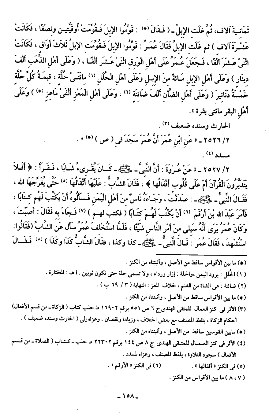 ثَمَانِيةَ آلاف، ثُمَّ غَلَتِ الإِبِلُ - (فَقَالَ (*): قَوِّمُوا الإبِلَ فَقُوِّمَتْ أُوقَيِّتين ونِصْفًا، فَكَانَتْ عَشْرَةَ آلافٍ) ثم غَلَتِ الإبِلُ فَقَالَ عُمَرُ: قَوِّمُوا الإبِلَ فَقُوِّمَت الإبلُ ثَلَاثَ أَوَاقٍ، فَكَانَتْ اثْنَى عَشَرَ أَلْفًا، فَجَعَلَ عُمَرُ عَلَى أَهْلِ الْوَرِقِ اثْنَى عَشَر أَلْفًا، (وَعَلَى أَهْلِ الذَّهَب أَلْفَ دِينَارِ) وَعَلَى أَهْلِ الإِبِلِ مَائةً مِنَ الإِبِلِ وَعَلَى أَهْلِ الْحُلَلِ (¬1) مائَتَى حُلَّةٍ، قِيمَةُ كُلِّ حُلَّةٍ خَمْسَةُ دَنَانِيرَ (وَعَلَى أَهْلِ الضَّأنِ أَلْفَ ضَائِنَةٍ (¬2)، وَعَلَى أَهْلِ الْمَعْزِ أَلْفَى مَاعِزٍ *)) وَعَلَى أَهْلِ البقر مائتى بقرة".