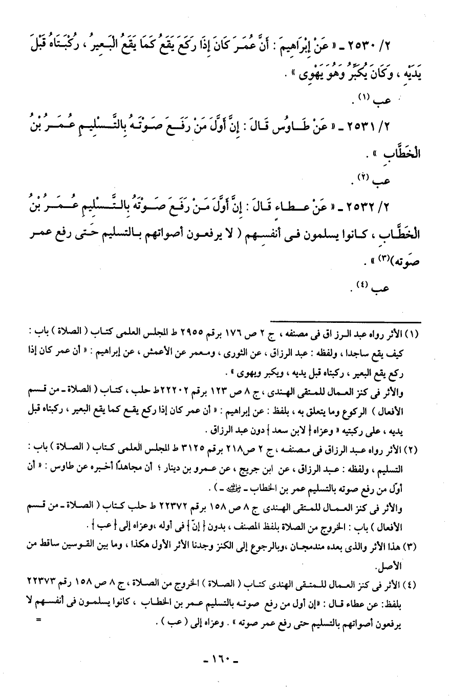 (¬4) الأثر في كنز العمال للمتقى الهندى كتاب (الصلاة) الخروج من الصلاة، جـ 8 ص 158 رقم 22373 بلفظ: عن عطاء قال: "إن أول من رفع صوته بالتسليم عمر بن الخطاب، كانوا يسلمون في أنفسهم لا يرفعون أصواتهم بالتسليم حتى رفع عمر صوته". وعزاه إلى (عب). =