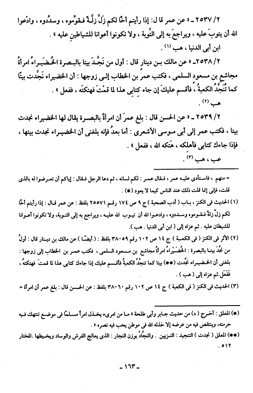 (¬2) الأثر في الكنز (في الكعبة) جـ 14 ص 102 رقم 38059 بلفظ: (أيضًا) عن مالك بن دينار قال: أولُ من نجَّدَ بيتا بالبصرة: الخُضَيْراءُ امرأةُ مجاشع بن مسعود السلمى، فكتب عمر بن الخطاب إلى زوجها: بلغنى أن الخضيراء نجَّدت (* *) بيتا كما تنجَّدُ الكعبةُ فأقسم عليك إذا جاءك كتابى هذا لما قمتَ فهتكتهُ، فَفَعَل. ثم عزاه إلى (هب).