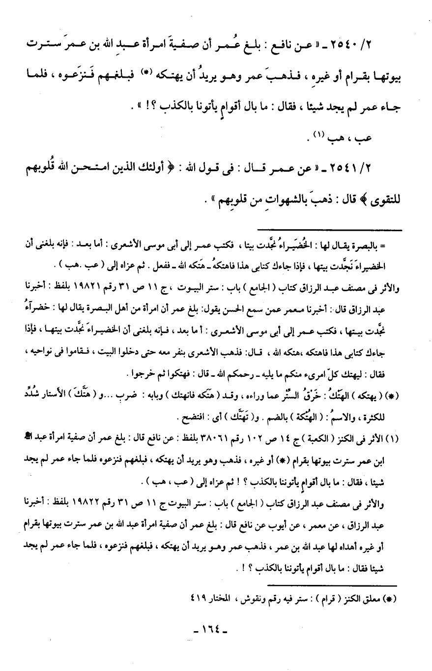 2/ 2540 - "عن نافع: بلغ عُمر أن صفيةَ امرأة عبدِ اللَّه بن عمرَ سترت بيوتها بقرام أو غيرهِ، فذهبَ عمر وهو يريدُ أن يهتكه (*) فبلغهم فَنزَعوه، فلما جاء عمر لم يجد شيئا، فقال: ما بال أقوامٍ يأتونا بالكذب؟ ! ".