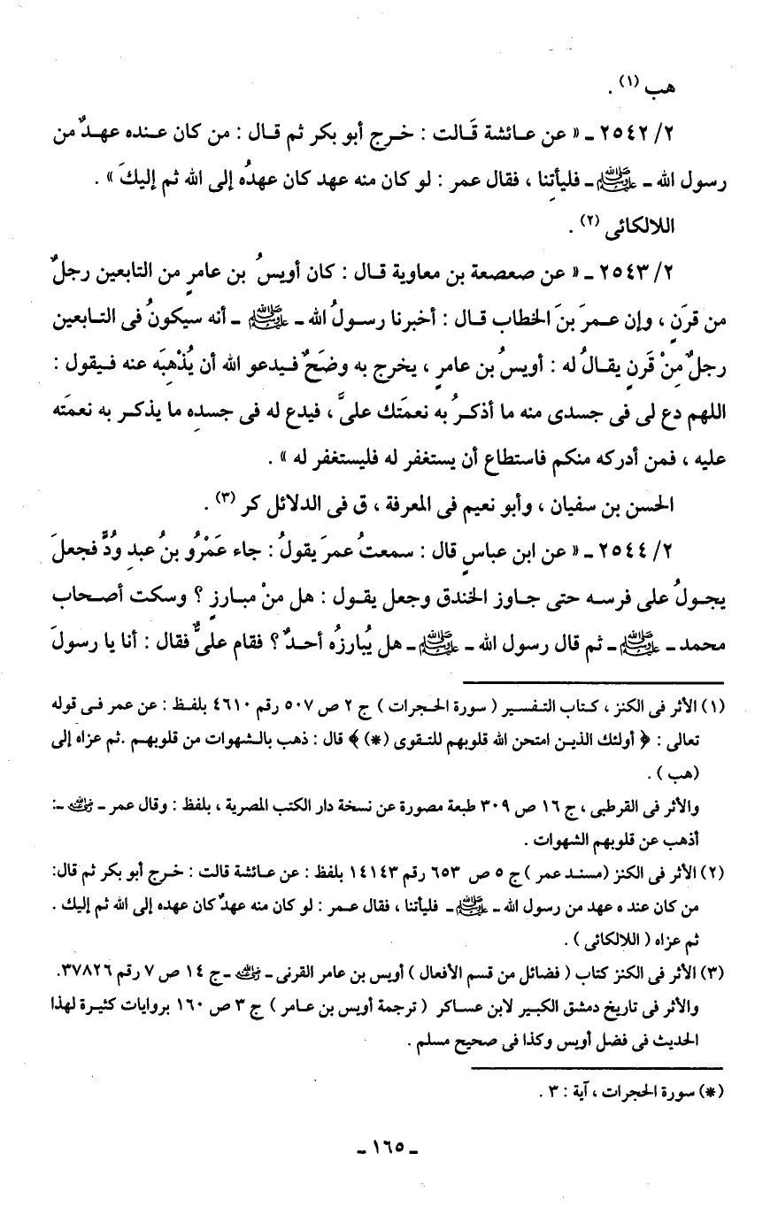 (¬3) الأثر في الكنز كتاب (فضائل من قسم الأفعال) أويس بن عامر القرنى -رضي اللَّه عنه- جـ 14 ص 7 رقم 37826. والأثر في تاريخ دمشق الكبير لابن عساكر (ترجمة أويس بن عامر) جـ 3 ص 160 بروايات كثيرة لهذا الحديث في فضل أويس وكذا في صحيح مسلم.