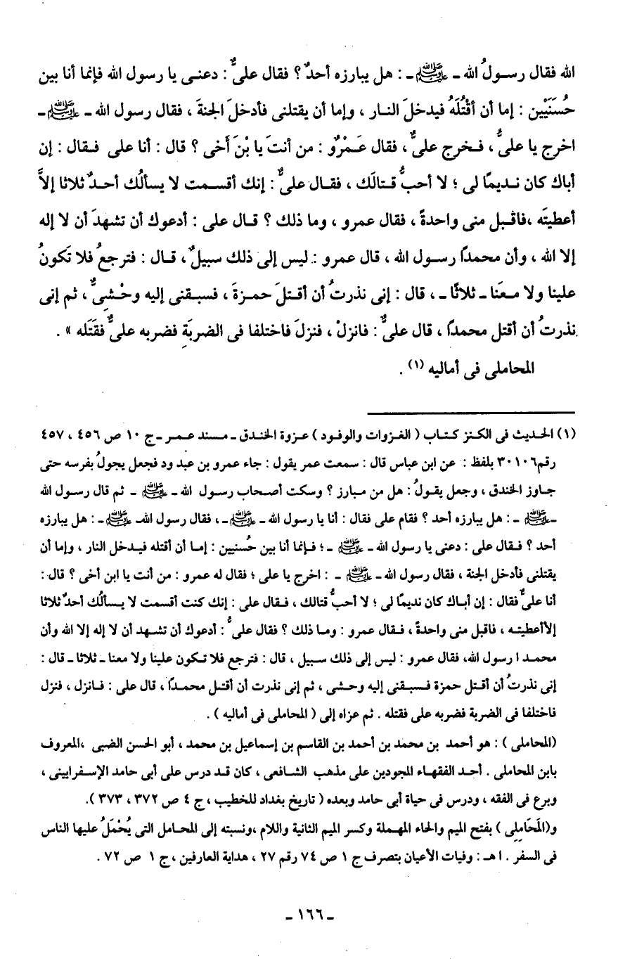(¬1) الحديث في الكنز كتاب (الغزوات والوفود) عزوة الخندق - مسند عمر - جـ 10 ص 456، 457 رقم 30106 بلفظ: عن ابن عباس قال: سمعت عمر يقول: جاء عمرو بن عبد ود فجعل يجولُ بفرسه حتى جاوز الخندق، وجعل يقولُ: هل من مبارز؟ وسكت أصحاب رسول اللَّه -صلى اللَّه عليه وسلم- ثم قال رسول اللَّه -صلى اللَّه عليه وسلم-: هل يبارزه أحد؟ فقام على فقال: أنا يا رسول اللَّه -صلى اللَّه عليه وسلم-، فقال رسول -صلى اللَّه عليه وسلم-: هل يبارزه أحد؟ فقال على: دعنى يا رسول اللَّه -صلى اللَّه عليه وسلم-؛ فإنما أنا بين حُسنيين: إما أن أقتله فيدخل النار، وإما أن يقتلنى فأدخل الجنة، فقال رسول اللَّه -صلى اللَّه عليه وسلم-: اخرج يا على؛ فقال له عمرو: من أنت يا ابن أخى؟ قال: أنا عليٌّ فقال: إن أباك كان نديمًا لى؛ لا أحبُّ قتالك، فقال على: إنك كنت أقسمت لا يسألُك أحدٌ ثلاثا إلّا أعطيته، فأقبل منى واحدةً، فقال عمرو: وما ذلك؟ فقال عليُّ: أدعوك أن تشهد أن لا اله إلا اللَّه وأن محمدا رسول اللَّه، فقال عمرو: ليس إلى ذلك سبيل، قال: فترجع فلا تكون علينا ولا معنا -ثلاثا- قال: إنى نذرتُ أن أقتل حمزة فسبقنى إليه وحشى، ثم إنى نذرت أن أقتل محمدًا، قال على: فانزل، فنزل فاختلفا في الضربة فضربه على فقتله. ثم عزاه إلى (المحاملى في أماليه).