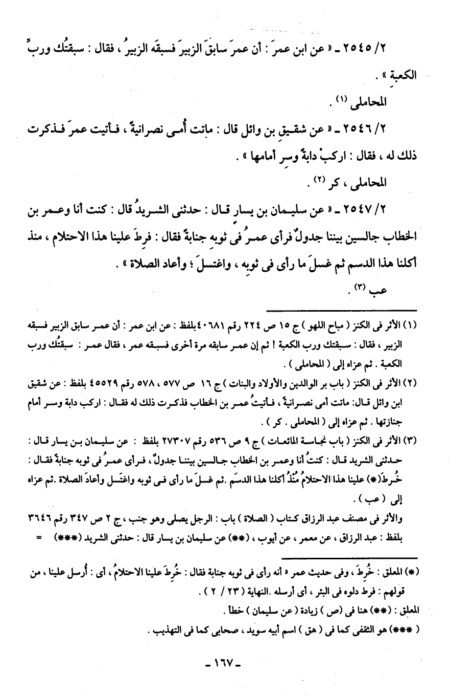 (¬3) الأثر في الكنز (باب نجاسة المائعات) جـ 9 ص 536 رقم 27307 بلفظ: عن سليمان بن يسار قال: حدثنى الشريد قال: كُنْتُ أنا وعمر بن الخطاب جالسين بيننا جدولٌ، فرأى عمرُ في ثوبه جنابةً فقال: خُرطَ (*) علينا هذا الاحتلامُ منذُ أكلنا هذا الدسَم. ثم غسلَ ما رأى في ثوبه واغتسل وأعادَ الصلاة. ثم عزاه إلى (عب).