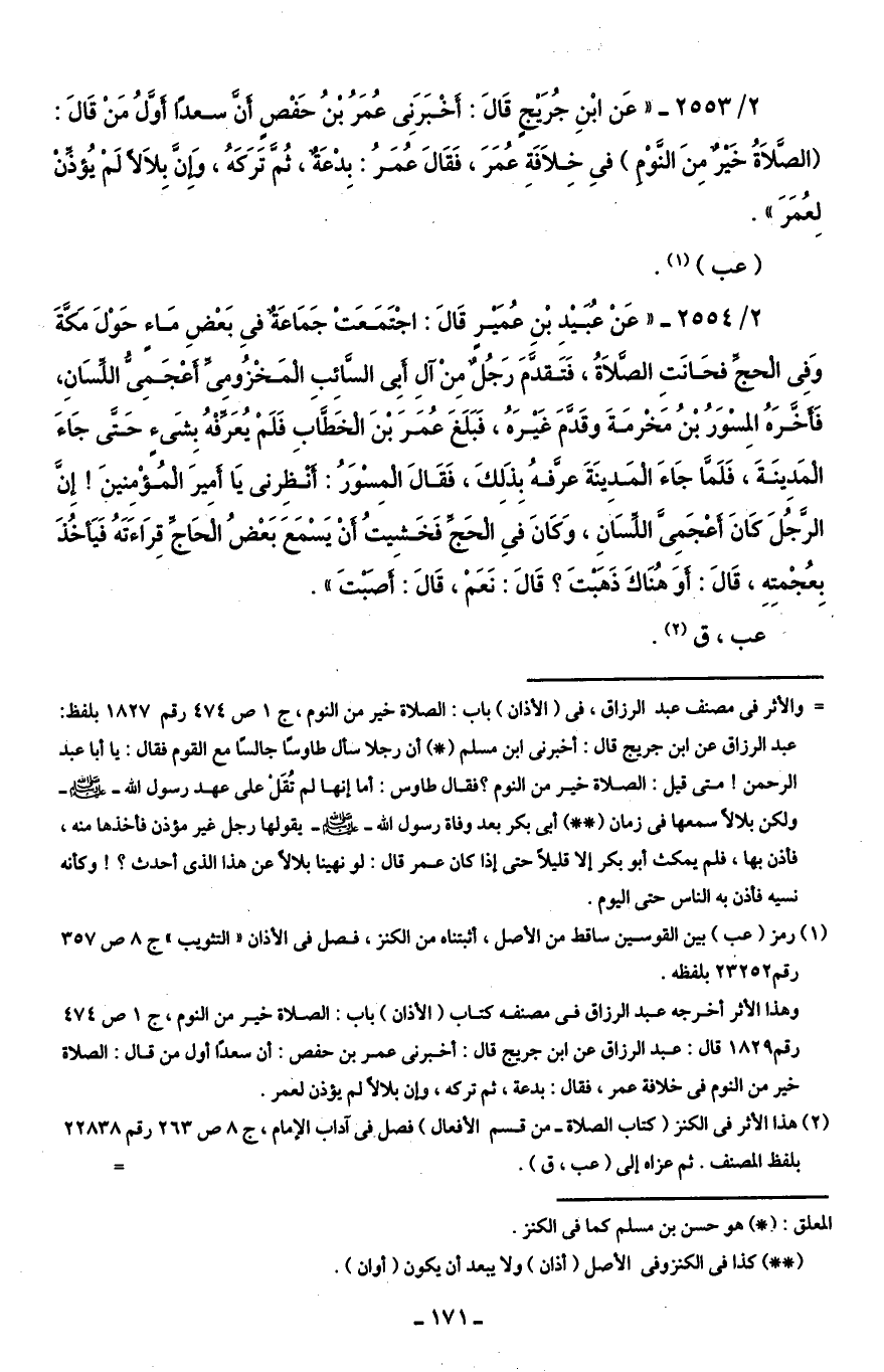 2/ 2553 - "عَن ابْنِ جُرَيْجٍ قَالَ: أَخْبَرَنِى عُمَرُ بْنُ حَفْصٍ أَنَّ سعدًا أَوَّلُ مَنْ قَالَ: (الصَّلَاةُ خَيرٌ مِنَ النَّوْمِ) فِي خِلَافَةِ عُمَرَ، فَقَالَ عُمَرُ: بِدْعَةٌ، ثُمَّ تَرَكَهُ، وَإِنَّ بِلَالًا لَمْ يُؤذِّنْ لِعُمَرَ".