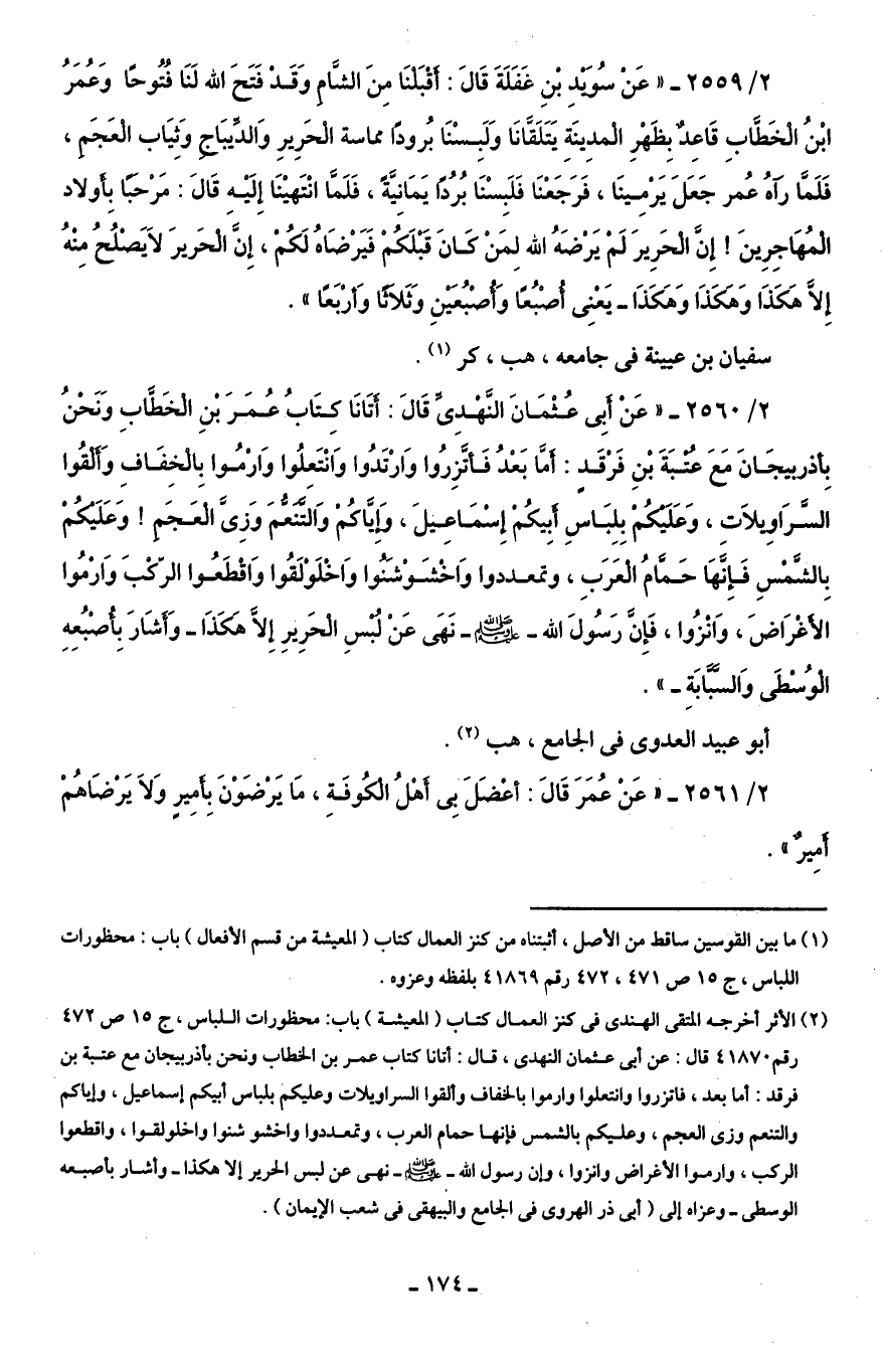 2/ 2560 - "عَنْ أَبِى عُثْمَانَ النَّهْدِىِّ قَالَ: أَتَانَا كِتَابُ عُمَرَ بْنِ الْخَطَّابِ وَنَحْنُ بِأذربيجَانَ مَعَ عُتْبَةَ بْنِ فَرقَدٍ: أَمَّا بَعْدُ فَأتَّزِرُوا وَارْتَدُوا وَانْتَعِلُوا وَارْمُوا بِالْخِفَافِ وَأَلْقُوا السَّرَاوِيلَاتِ، وَعَلَيْكُمْ بِلِبَاسِ أَبِيكُمْ إِسْمَاعِيلَ، وَإِيَّاكُمْ وَالتَّنَعُّمَ وَزِىَّ الْعَجَمِ! وَعَلَيْكُمْ بِالشَّمْسِ فَإِنَّهَا حَمَّامُ الْعَرَبِ، وتمعددوا وَاخْشَوْشَنُوا وَاخْلَوْلَقُوا وَاقْطَعُوا الرّكْبَ وَارْمُوا الأَغْرَاضَ، وَانْزُوا، فَإِنَّ رَسُولَ اللَّه -صلى اللَّه عليه وسلم- نَهَى عَنْ لُبْسِ الْحَرِيرِ إِلَّا هَكَذَا -وَأَشَارَ بِأُصْبُعِهِ الوُسْطَى وَالسَّبَّابَةِ-".