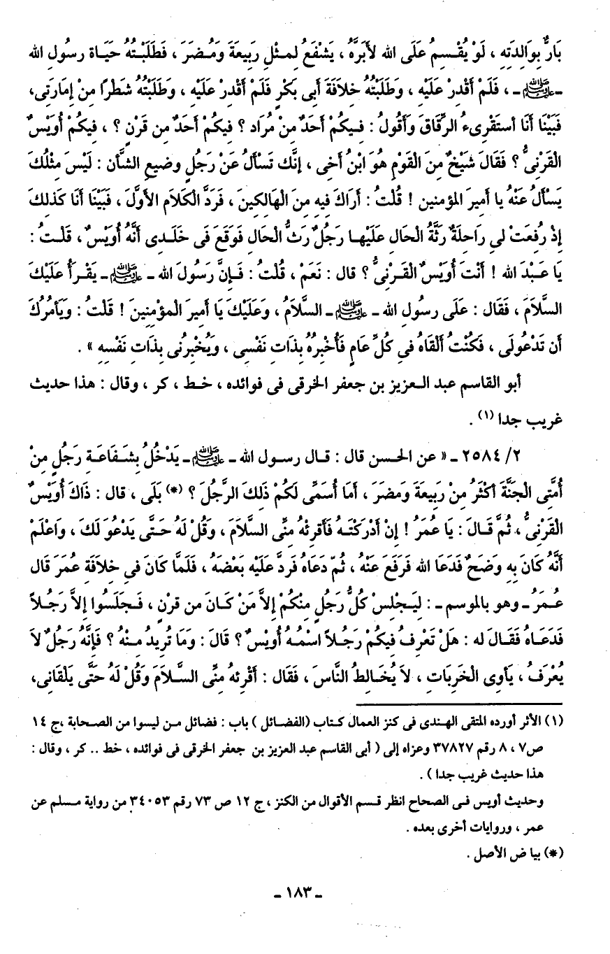 2/ 2584 - "عن الحسن قال: قال رسول اللَّه -صلى اللَّه عليه وسلم- يَدْخُلُ بِشَفَاعَةِ رَجُلٍ مِنْ أُمَّتِى الْجَنَّةَ أَكْثَرُ مِنْ رَبِيعَةَ وَمضَرَ، أمَا أُسَمِّى لَكُمْ ذَلِكَ الرَّجُلَ؟ (*) بَلَى، قال: ذَاكَ أُوَيْسٌ الْقَرْنِىُّ، ثُمَّ قَالَ: يَا عُمَرُ! إِنْ أَدْرَكْتَهُ فَأَقرِئْهُ مِنِّى السَّلَامَ، وَقُلْ لَهُ حَتَّى يَدْعُوَ لَكَ، وَاعْلَمْ أَنَّهُ كَانَ بِهِ وَضَحٌ فَدَعَا اللَّه فَرَفَعَ عَنْهُ، ثُمَّ دَعَاهُ فَردَّ عَلَيْه بَعْضَهُ، فَلَمَّا كَانَ فِى خِلَافَةِ عُمَرَ قَال عُمَرُ -وهو بالموسم-: لِيَجْلِسْ كُلُّ رَجُلٍ مِنْكُمْ إِلَّا مَنْ كَانَ من قرْنٍ، فَجَلَسُوا إلَّا رَجُلًا فَدَعَاهُ فَقَالَ له: هَلْ تَعْرِفُ فِيكُمْ رَجُلًا اسْمُهُ أُويْسٌ؟ قَالَ: وَمَا تُرِيدُ مِنْهُ؟ فَإِنَّهُ رَجُلٌ لَا يُعرَفُ، يَأوِى الْخَرِبَاتِ، لَا يُخَالِطُ النَّاسَ، فَقَال: أَقْرِئهُ مِنِّى السَّلَامَ وَقُلْ لَهُ حَتَّى يَلْقَانِى،