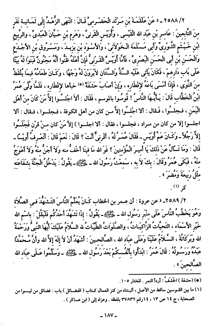 2/ 2588 - "عَن عَلْقَمَةَ بْنِ مَرْثَدٍ الْحَضْرمِىِّ قَالَ: انْتَهَى الزُّهْدُ إِلَى ثَمَانِيةِ نَفَرٍ مِنَ التَّابِعِينَ: عَامِرِ بْنِ عَبْدِ اللَّه الْقَيْسِى، وَأُوَيْسٍ الْقَرنىِّ، وَهَرِمِ بْنِ حَيَّانَ الْعَبْدِىِّ، والرَّبِيعِ ابْنِ خَيْثَمٍ الثَّوْرِىِّ وَأَبِى مَسْلَمَة الْخَوْلَانِىّ، وَالأَسْوَدِ بْنِ يَزِيدَ، وَمَسْرُوقِ بْنِ الأَجْدعَ وَالْحَسَنِ بْنِ أَبِى الْحَسَنِ البَصْرِىِّ، فَأَمَّا أُوَيْسٌ الْقَرْنِىُّ فَإِنَّ أَهْلَهُ ظَنُّوا أَنَّهُ مَجْنُونٌ فَبَنَوْا لَهُ بَيْتًا عَلَى بَابِ دَارِهِمْ، فَكَانَ يَأتِى عَلَيْه السَّنَةُ وَالسَّنَتَانِ لَا يَرَوْنَ لَهُ وَجْهًا، وَكَانَ طَعَامُهُ فِيمَا يُلْقَطُ مِنَ النَّوَى، فَإِذَا أَمْسَى بَاعَهُ لإِفْطَارِهِ، وَإِنْ أَصَابَ حَشَفَةً (*) خبأها لإِفْطَارِه، فَلَمَّا وُلِّىَ عُمَرُ ابْنُ الْخَطَّابِ قَالَ: يَا أَيُّهَا النَّاسُ! قُومُوا بالموسم، فَقَال: أَلَا اجْلسُوا إلَّا مَنْ كَانَ مِنْ أَهْلِ الْيَمَنِ، فجلسُوا، فَقال: ألا اجْلِسُوا إلَّا من كان من أهل الكوفة، فجلسوا، فقال: ألا اجلسوا إلا من كان من مراد، فجلسوا، فقال: ألا اجلسوا) إلّا مَنْ كان مِنْ قرْنٍ فَجَلَسُوا إِلَّا رَجُلًا -وَكَانَ عَمَّ أُوَيْسٍ- فَقَالَ عُمَرُ لَهُ، أَقَرنِىٌّ أَنْتَ؟ قَالَ: نَعَمْ قَالَ: أَتَعْرِفُ أُويْسًا - قَالَ: وَمَا تَسْألُ عَن ذَلِكَ يَا أَمِيرَ الْمُؤْمِنِينَ؟ فَوَاللَّه مَا فِينَا أَخَفُّ منه وَلَا أَجَنُّ مِنْهُ وَلَا أَهْوَجُ مِنْهُ، فَبَكَى عُمَرُ وَقَالَ: بِكَ لَا بِهِ، سَمِعْتُ رَسُولَ اللَّه -صلى اللَّه عليه وسلم- يَقُولُ: يَدْخُلُ الَجَنَّةَ بِشَفَاعَتِهِ مِثلُ رَبِيعَةَ وَمُضَرَ".