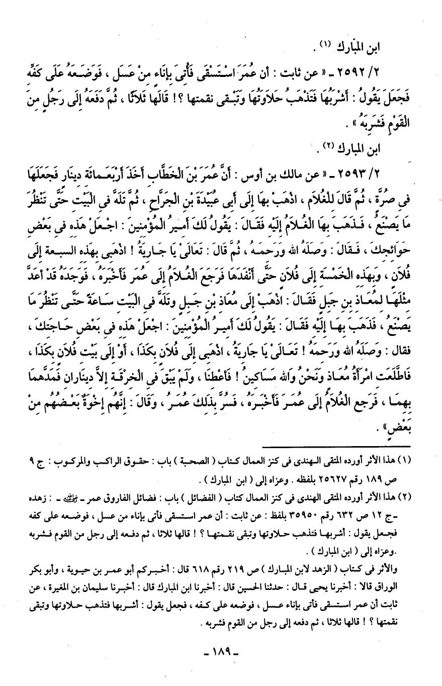 (¬2) هذا الأثر أورده المتقى الهندى في كنز العمال كتاب (الفضائل) باب: فضائل الفاروق عمر -رضي اللَّه عنه-: زهده - جـ 12 ص 632 رقم 35950 بلفظ: عن ثابت: أن عمر استسقى فأتى بإناء من عسل، فوضعه على كفه فجعل يقول: أشربها فتذهب حلاوتها وتبقى نقمتها؟ ! قالها ثلاثا، ثم دفعه إلى رجل من القوم فشربه. وعزاه إلى (ابن المبارك).