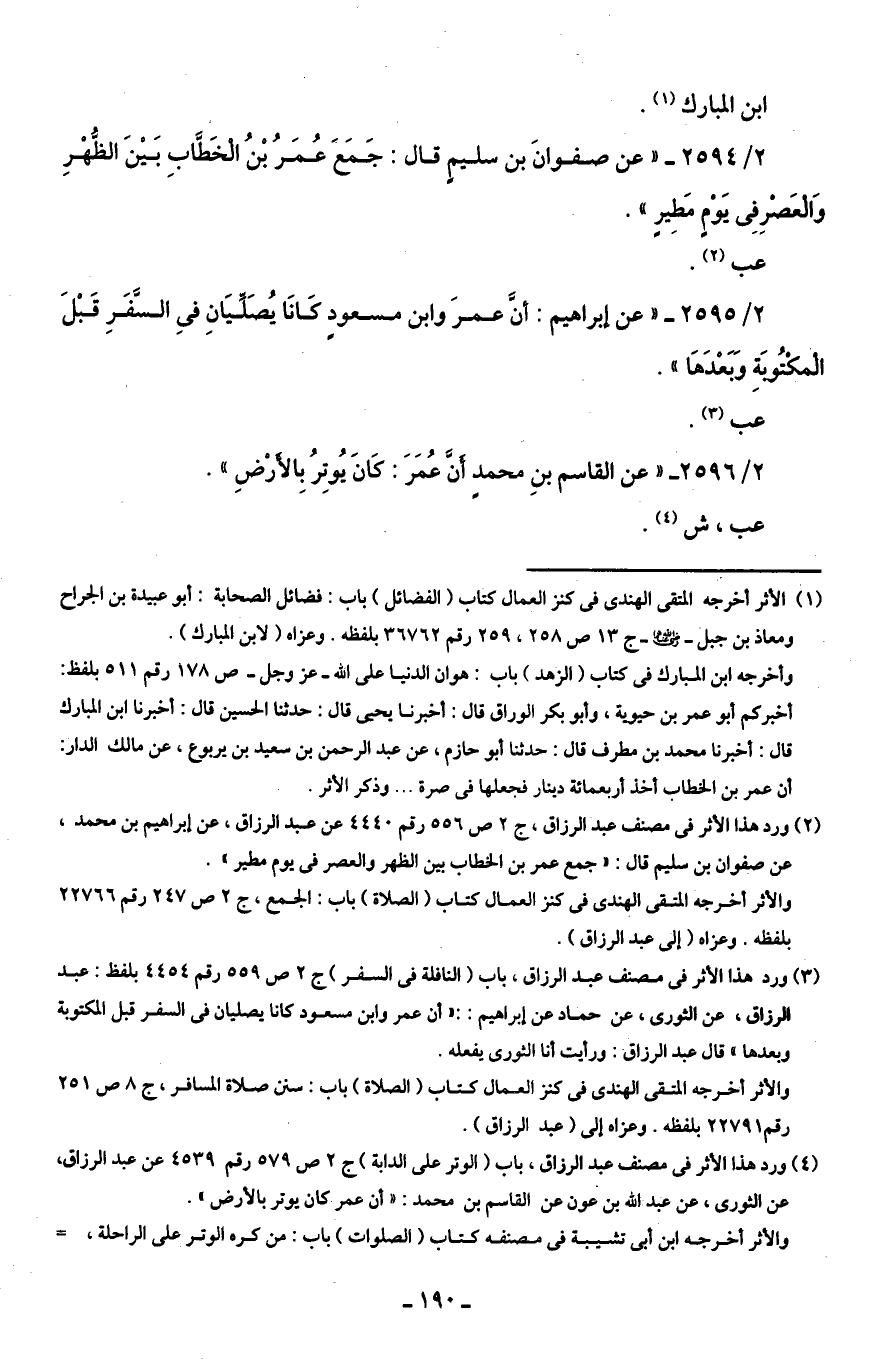 (¬2) ورد هذا الأثر في مصنف عبد الرزاق، جـ 2 ص 556 رقم 4440 عن عبد الرزاق، عن إبراهيم بن محمد، عن صفوان بن سليم قال: "جمع عمر بن الخطاب بين الظهر والعصر في يوم مطير".