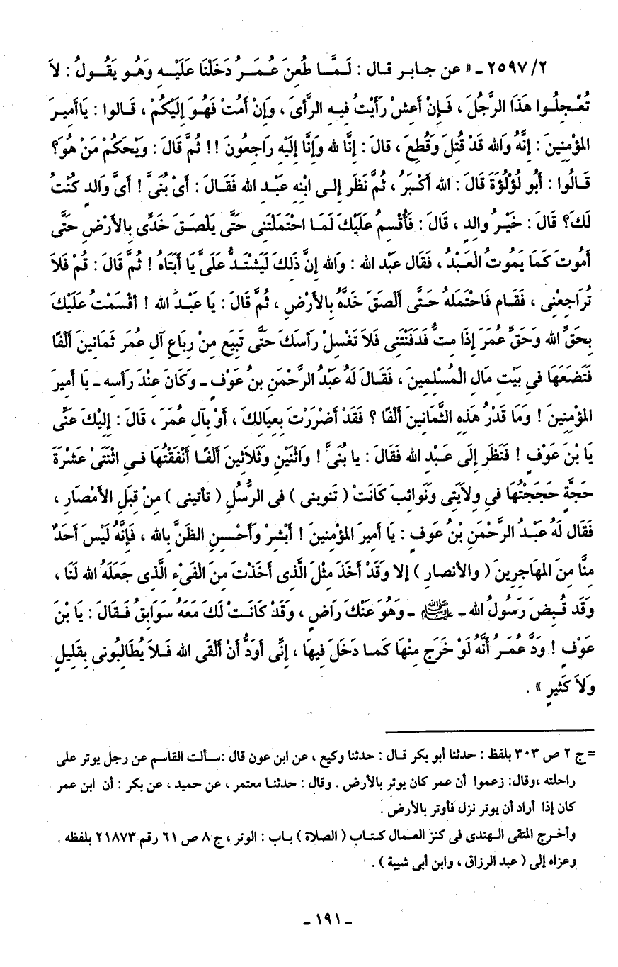 2/ 2597 - "عن جابر قال: لَمَّا طُعِنَ عُمَرُ دَخَلْنَا عَلَيْهِ وَهُو يَقُولُ: لَا تُعْجِلُوا هَذَا الرَّجُلَ، فَإِنْ أَعِشْ رَأَيْتُ فيهِ الرَّأى، وَإِنْ أَمُتْ فَهُوَ إِلَيكُمْ، قَالوا: يَا أَمِيرَ المؤْمِنِينَ: إِنَّهُ وَاللَّه قَدْ قُتِلَ وَقُطِعَ، قالَ: إِنَّا للَّه وَإِنَّا إِلَيْه رَاجِعُونَ! ! ثُمَّ قَالَ: وَيْحَكُمْ مَنْ هُوَ؟ قَالُوا: أَبُو لُؤْلُؤَةَ قَالَ: اللَّه أَكْبَرُ، ثُمَّ نَظَر إِلى ابْنِهِ عبدِ اللَّه فَقَالَ: أَىْ بُنَىَّ! أَىَّ وَالدٍ كُنْتُ لَكَ؟ قَالَ: خَيْرُ والِدٍ، قَالَ: فَأُقْسِمُ عَلَيْكَ لَمَا احْتَمَلْتَنِى حَتَّى يَلْصَقَ خَذِّى بالأَرْضِ حَتَّى أَمُوتَ كَمَا يَمُوتُ الْعَبْدُ، فَقَال عَبْد اللَّه: وَاللَّه إِنَّ ذَلِكَ لَيَشْتَدُّ عَلَىَّ يَا أَبَتَاهُ! ثُمَّ قَالَ: قُمْ فَلَا تُرَاجعْنِى، فَقَام فَاحْتَمَلهُ حَتَّى أَلْصَقَ خَذَّهُ بِالأَرْضِ، ثُمَّ قَالَ: يَا عَبْدَ اللَّه! أقْسَمْتُ عَلَيْكَ بِحَقِّ اللَّه وَحَقِّ عُمَرَ إِذَا مِتُّ فَدَفَنْتَنِى فَلَا تَغْسِلْ رَأسَكَ حَتَّى تَبِيَع مِنْ رِبَاع آلِ عُمَر ثَمَانِينَ أَلْفًا فَتَضَعَهَا فِى بَيْتِ مَالِ الْمُسْلِمِينَ، فَقَالَ لَهُ عَبْدُ الرَّحْمَنِ بنُ عَوْفٍ -وَكَانَ عِنْدَ رَأسِه- يَا أَمِيرَ المُؤْمِنِينَ! وَمَا قَدْرُ هَذِهِ الثَّمَانِينَ أَلْفًا؟ فَقَدْ أَضْرَرْتَ بِعِيَالِكَ، أَوْ بِآلِ عُمَرَ، قَالَ: إِلِيْكَ عَنِّى يَا بْنَ عَوْفٍ! فَنَظَر إِلَى عَبْدِ اللَّه فَقَالَ: يا بُنَىَّ! وَاثْنَيْنِ وَثَلَاثِينَ أَلْفًا أَنْفَقْتُهَا فِى اثْنَتَىْ عَشْرَةَ حَجَّةٍ حَجَجْتُهَا فِى وِلَايَتِى وَنَوائِبَ كَانَتْ (تَنوينى) في الرُّسُلِ (تأتينى) مِنْ قِبَلِ الأَمْصَارِ، فَقَال لَهُ عَبْدُ الرَّحمَنِ بْنُ عَوفٍ: يَا أَمِيرَ المؤمنينَ! أَبْشِرْ وَأَحْسِنِ الظَنَّ بِاللَّه، فَإِنَّهُ لَيْسَ أَحَدٌ مِنَّا مِنَ المهَاجِرِينَ (والأَنْصَارِ) إلا وَقَدْ أَخَذَ مِثْلَ الَّذِى أَخَذْتَ مِنَ الْفَىْءِ الَّذِى جَعَلَهُ اللَّه لَنَا، وَقَد قُبِضَ رَسُولُ اللَّه -صلى اللَّه عليه وسلم- وَهُوَ عَنْكَ رَاضٍ، وَقَد كَانَتْ لَكَ مَعَهُ سَوَابِقُ فَقَالَ: يَا بْنَ عَوْفٍ! وَدَّ عُمَرُ أَنَّهُ لَوْ خَرَج مِنْهَا كَما دَخَلَ فِيهَا، إِنِّى أوَدُّ أَنْ أَلْقَى اللَّه فَلَا يُطَالِبُونى بِقَلِيلٍ وَلَا كَثيرٍ".