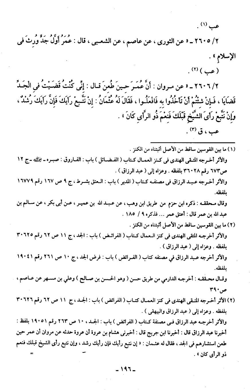 2/ 2605 - "عن الثورى، عن عاصم، عن الشعبى، قال: عُمَرُ أَوَّلُ جَدٍّ وُرِثَ في الإسلامِ".