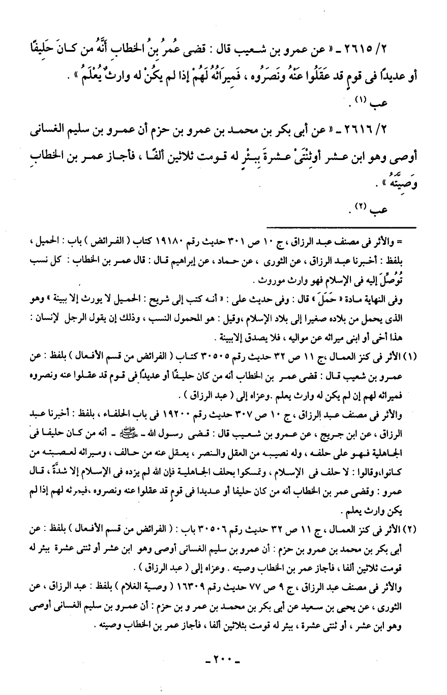 (¬1) الأثر في كنز العمال، جـ 11 ص 32 حديث رقم 30505 كتاب (الفرائض من قسم الأفعال) بلفظ: عن عمرو بن شعيب قال: قضى عمر بن الخطاب أنه من كان حليفًا أو عديدًا في قوم قد عقلوا عنه ونصروه فميراثه لهم إن لم يكن له وارث يعلم. وعزاه إلى (عبد الرزاق).