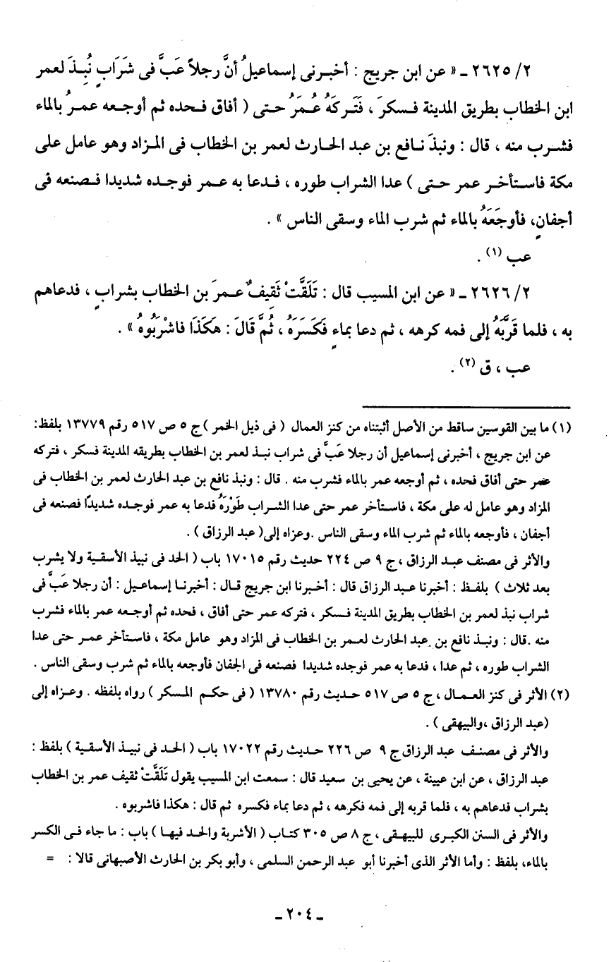 2/ 2625 - "عن ابن جريج: أخبرنى إسماعيلُ أَنَّ رجلًا عَبَّ في شَرَابٍ نُبِذَ لعمر ابن الخطاب بطريق المدينة فسكرَ، فَتَركَهُ عُمَرُ حتى (أفاق فحده ثم أوجعه عمرُ بالماء فشرب منه، قال: ونبذَ نافع بن عبد الحارث لعمر بن الخطاب في المزاد وهو محامل على مكة فاستأخر عمر حتى) عدا الشراب طوره، فدعا به عمر فوجده شديدا فصنعه في أجفانٍ، فأوجَعَهُ بالماء ثم شرب الماء وسقى الناس".