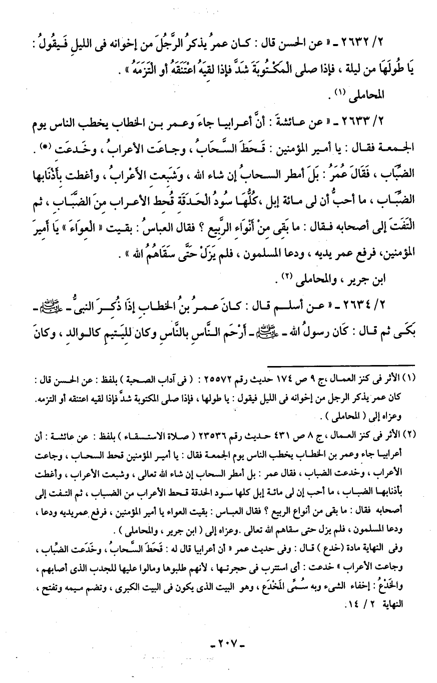 (¬1) الأثر في كنز العمال، جـ 9 ص 174 حديث رقم 25572: (في آداب الصحبة) بلفظ: عن الحسن قال: كان عمر يذكر الرجل من إخوانه في الليل فيقول: يا طولها، فإذا صلى المكتوبة شدَّ فإذا لقيه اعتنقه أو التزمه. وعزاه إلى (المحاملى).