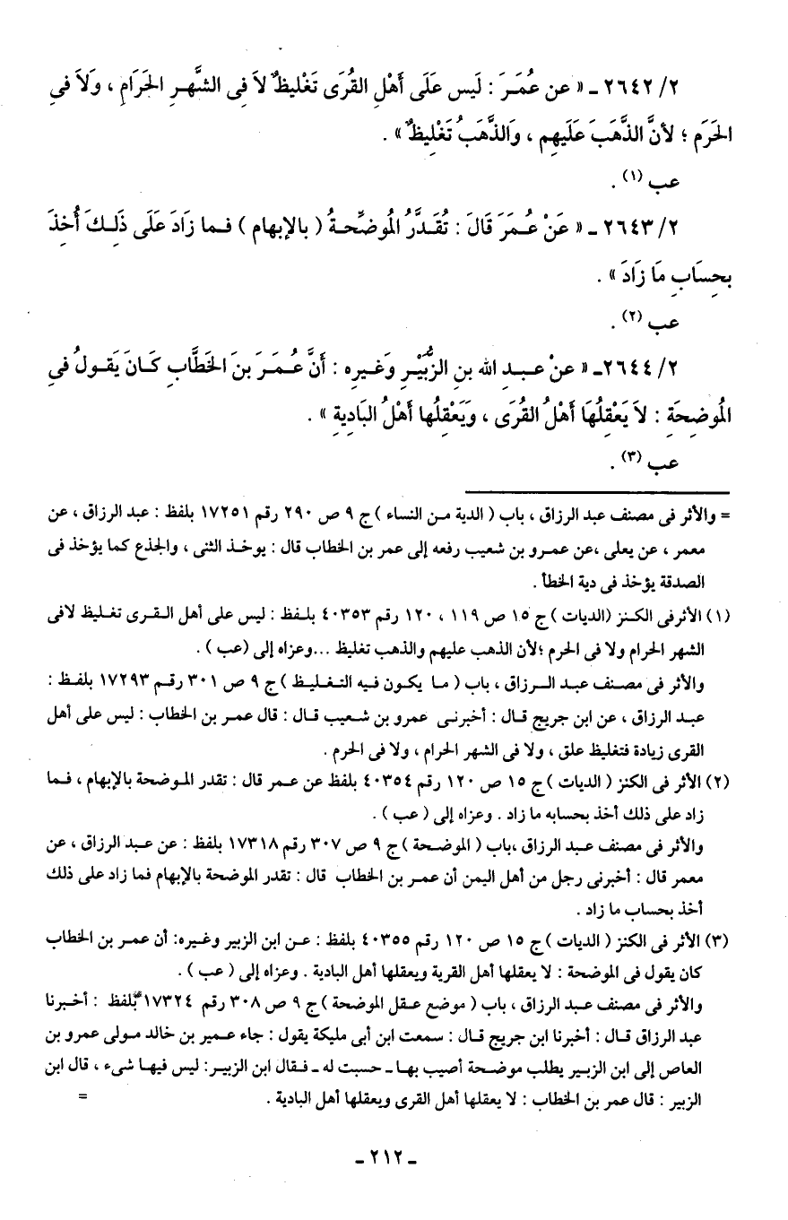 2/ 2642 - "عن عُمَرَ: لَيس عَلَى أَهْلِ القُرَى تَغْليظٌ لَا في الشَّهرِ الحَرَامِ، وَلَا في الحَرَم؛ لأنَّ الذَّهَبَ عَلَيهِم، وَالذَّهَبُ تَغْلِيظٌ".