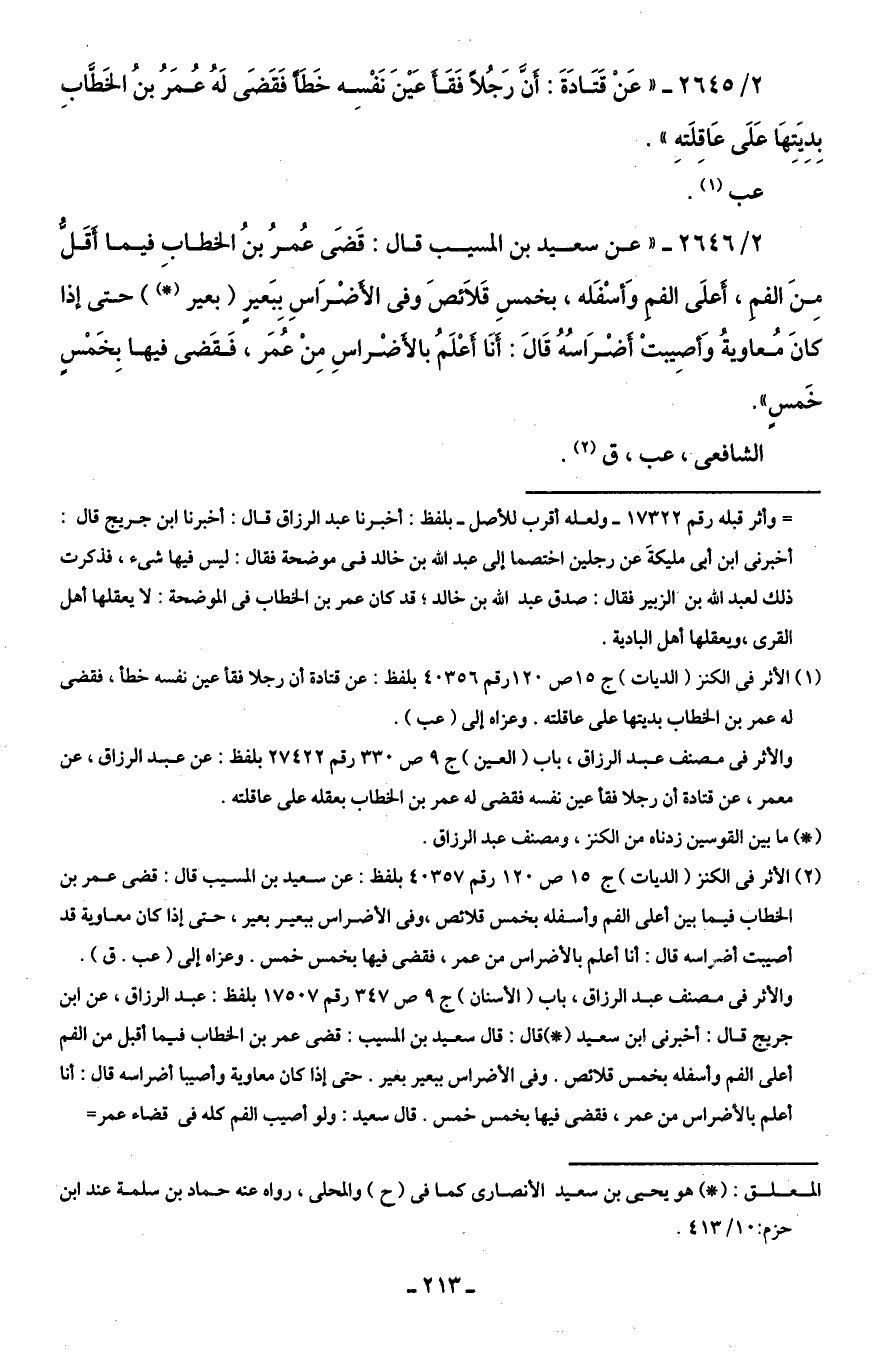 (¬2) الأثر في الكنز (الديات) جـ 15 ص 120 رقم 40357 بلفظ: عن سعيد بن المسيب قال: قضى عمر بن الخطاب فيما بين أعلى الفم وأسفله بخمس قلائص، وفى الأضراس ببعير بعير، حتى إذا كان معاوية قد أصيبت أضراسه قال: أنا أعلم بالأضراس من عمر، فقضى فيها بخمس خمس. وعزاه إلى (عب. ق).