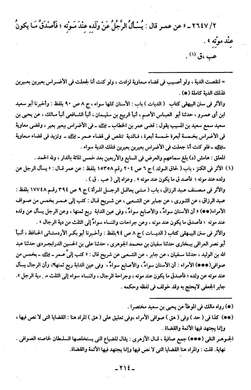 والأثر في سنن البيهقى كتاب (الديات) باب: الأسنان كلها سواء، جـ 8 ص 90 بلفظ: وأخبرنا أبو سعيد ابن أَبى عمرو، حدثنا أبو العباس الأصم، أنبأ الربيع بن سليمان، أنبأ الشافعى أنبأ مالك، عن يحيى بن سعيد سمع سعيد بن المسيب يقول: قضى عمر بن الخطاب -رضي اللَّه عنه- في الأضراس ببعير بعير، وقضى معاوية في الأضراس بخمسة أبعرة خمسة أبعرة، فالدية تنقص في قضاء عمر -رضي اللَّه عنه- وتزيد في قضاء معاوية -رضي اللَّه عنه- فلو كنت أنا جعلت في الأضراس بعيرين بعيرين فتلك الدية سواء.