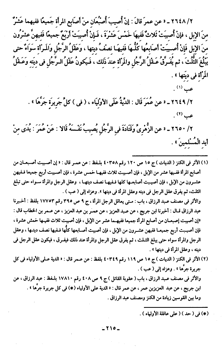 (¬1) الأثر في الكنز (الديات) جـ 15 ص 120 رقم 40358 بلفظ: عن عمر قال: "إن أصيبت أصبعان من أصابع المرأة ففيها عشر من الإبل، فإن أصيبت ثلاث ففيها خمس عشرة، فإن أصيبت أربع جميعا ففيهن عشرون من الإبل، فإن أصيبت أصابعها كلها ففيها نصف ديتها، وعقل الرجل والمرأة سواء حتى تبلغ الثلث، ثم يفرق عقل الرجل في ديته وعقل المرأة في ديتها". وعزاه إلى (عب).