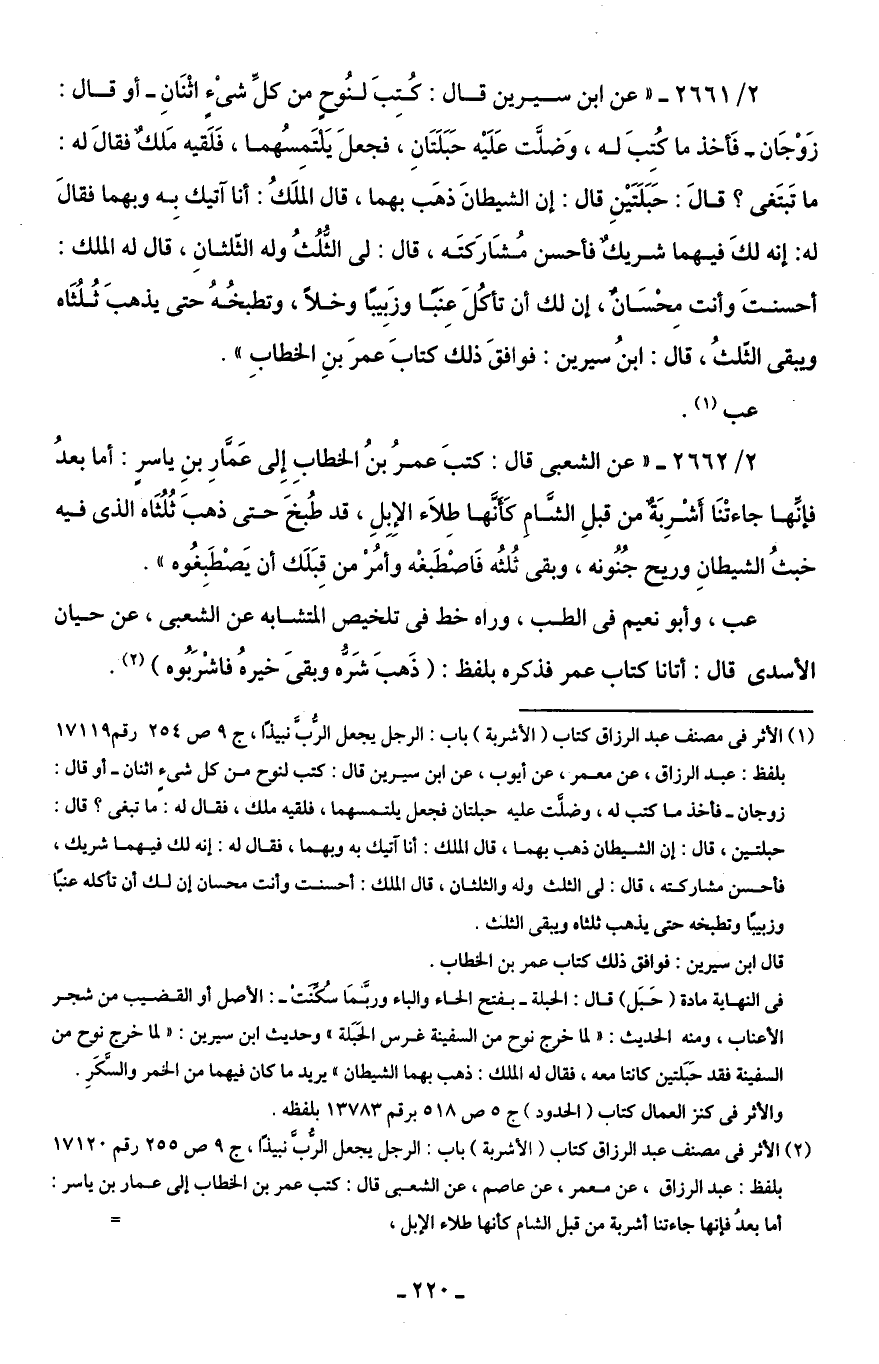 (¬2) الأثر في مصنف عبد الرزاق كتاب (الأشربة) باب: الرجل يجعل الرُّبَّ نبيذًا، جـ 9 ص 255 رقم 17120 بلفظ: عبد الرزاق، عن معمر، عن عاصم، عن الشعبى قال: كتب عمر بن الخطاب إلى عمار بن ياسر: أما بعدُ فإنها جاءتنا أشربة من قبل الشام كأنها طلاء الإبل، =