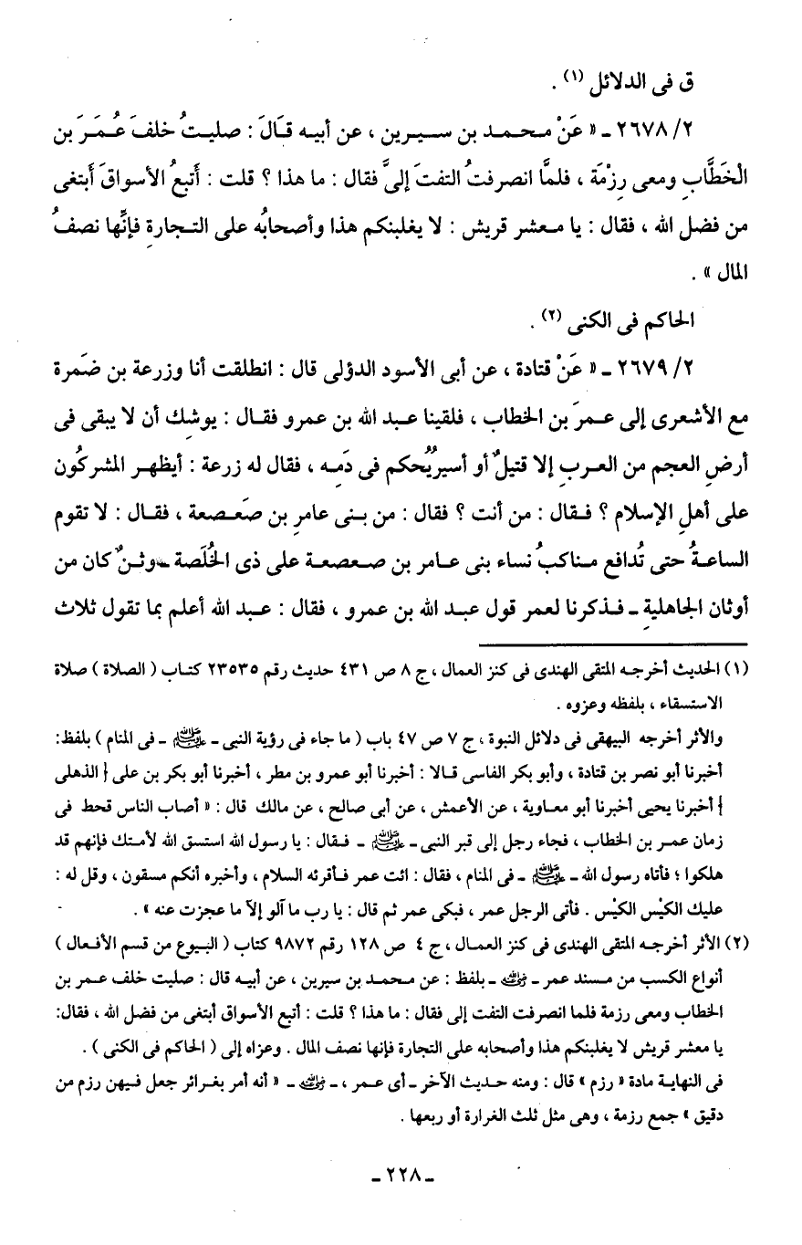 2/ 2679 - "عَنْ قتادة، عن أَبى الأسود الدؤلى قال: انطلقت أنا وزرعة بن ضَمرة مع الأشعرى إلى عمرَ بن الخطاب، فلقينا عبد اللَّه بن عمرو فقال: يوشِك أن لا يبقى في أرضِ العجم من العربِ إلا قتيلٌ أو أسيرُ يُحكم في دَمِه، فقال له زرعة: أيظهر المشركُون على أَهْلِ الإِسلام؟ فقال: من أنت؟ فقال: من بنى عامر بن صَعصعة، فقال: لا تقوم الساعةُ حتى تُدافع مناكبُ نساء بنى عامر بن صعصعة على ذى الخُلَصة -وثنٌ كان من أوثان الجاهليةِ- فذكرنا لعمر قول عبد اللَّه بن عمرو، فقال: عبد اللَّه أعلم بما تقول ثلاث