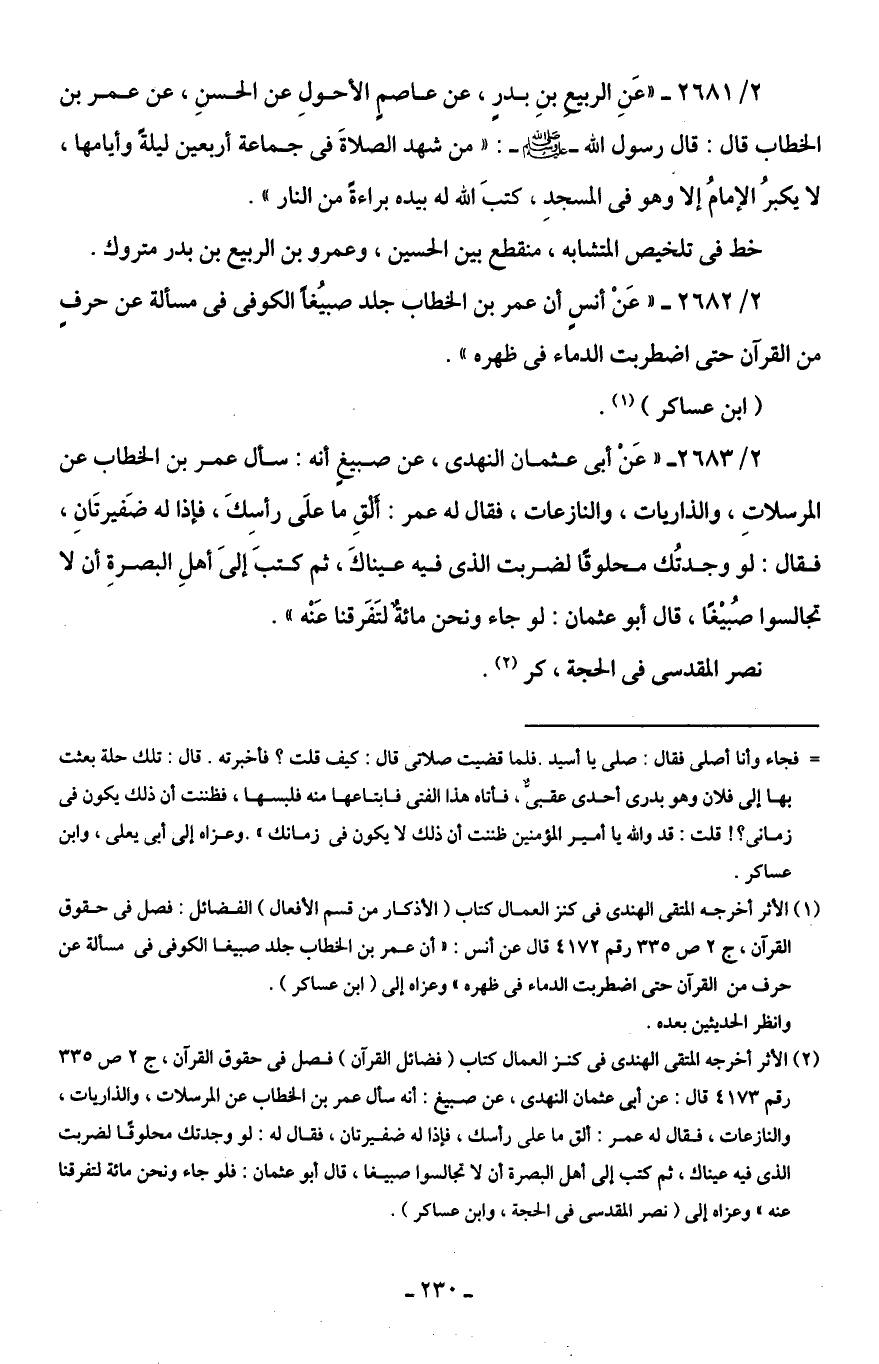 (¬1) الأثر أخرجه المتقى الهندى في كنز العمال كتاب (الأذكار من قسم الأفعال) الفضائل: فصل في حقوق القرآن، جـ 2 ص 335 رقم 4172 قال عن أنس: "أن عمر بن الخطاب جلد صبيغا الكوفى في مسألة عن حرف من القرآن حتى اضطربت الدماء في ظهره" وعزاه إلى (ابن عساكر).