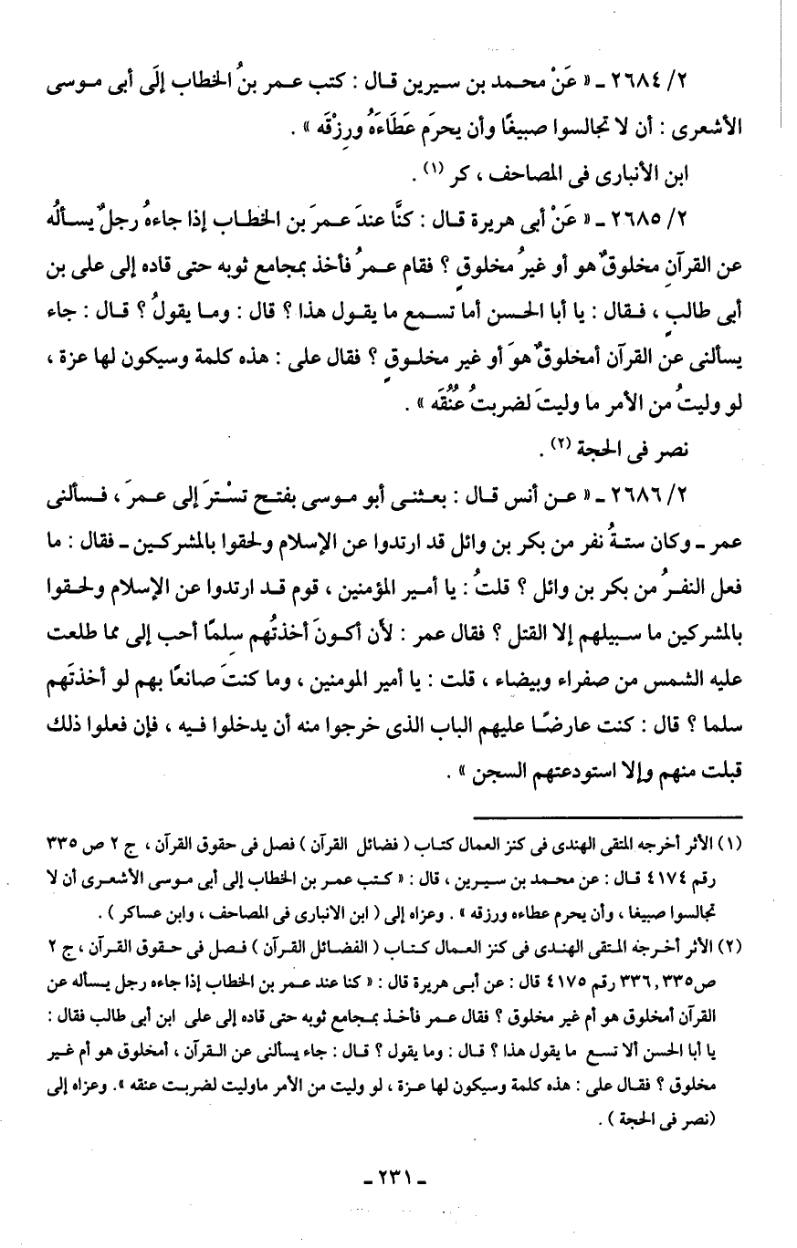 (¬2) الأثر أخرجه المتقى الهندى في كنز العمال كتاب (فضائل القرآن) فصل في حقوق القرآن، جـ 2 ص 335 , 336 رقم 4175 قال: عن أَبى هريرة قال: "كنا عند عمر بن الخطاب إذا جاءه رجل يسأله عن القرآن أمخلوق هو أم غير مخلوق؟ فقال عمر فأخذ بمجامع ثوبه حتى قاده إلى على ابن أَبى طالب فقال: يا أبا الحسن ألا تسمع ما يقول هذا؟ قال: وما يقول؟ قال: جاء يسألنى عن القرآن، أمخلوق هو أم غير مخلوق؟ فقال على: هذه كلمة وسيكون لها عزة، لو وليت من الأمر ما وليت لضربت عنقه". وعزاه إلى (نصر في الحجة).