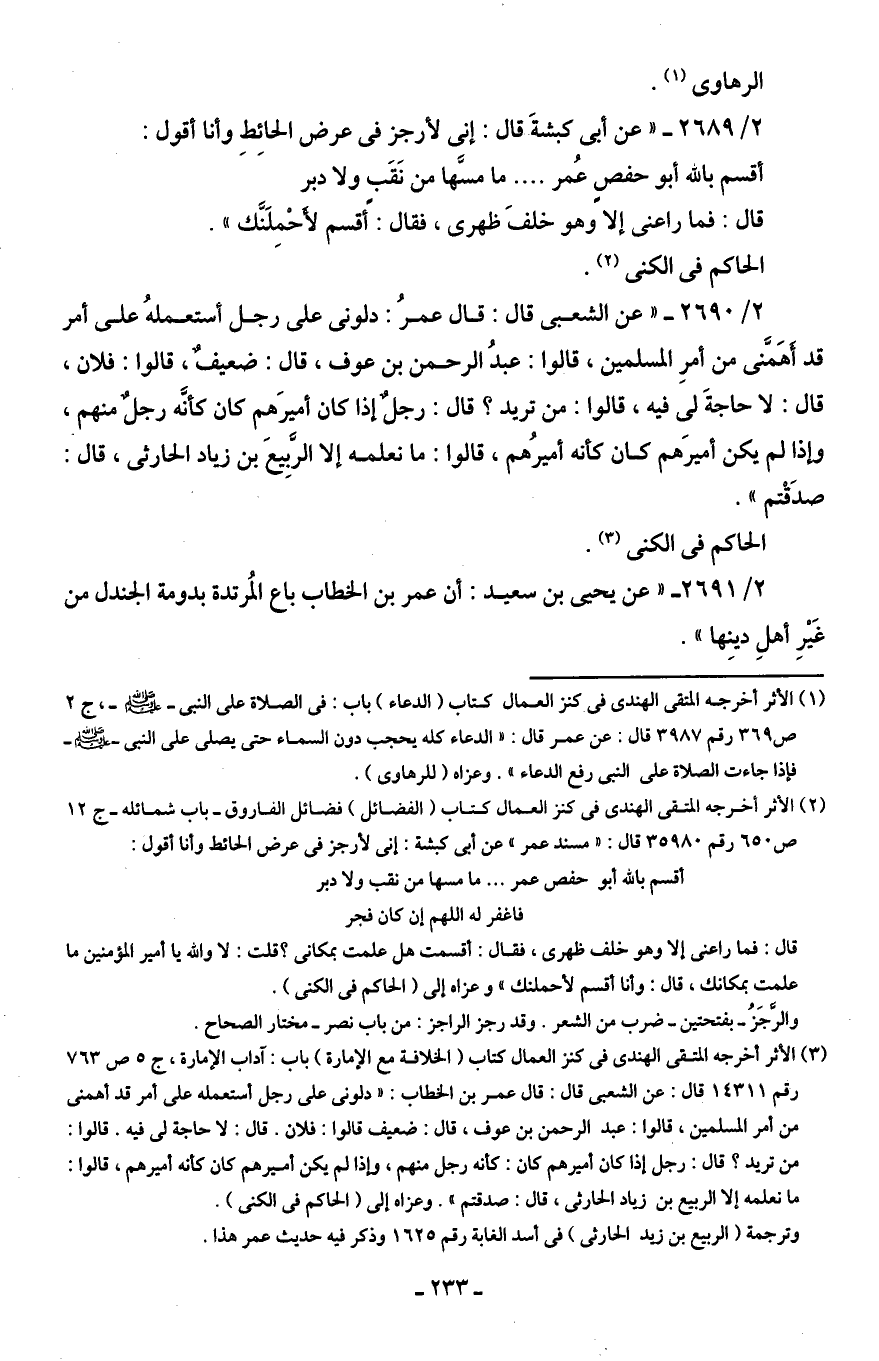 (¬2) الأثر أخرجه المتقى الهندى في كنز العمال كتاب (الفضائل) فضائل الفاروق - باب شمائله - جـ 12 ص 650 رقم 35980 قال: "مسند عمر" عن أَبى كبشة: إنى لأرجز في عرض الحائط وأنا أقول: