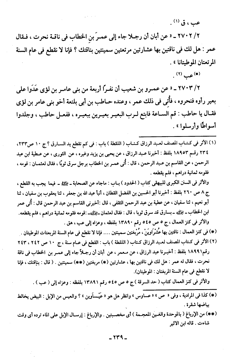 (¬2) الأثر في كتاب المصنف لعبد الرزاق كتاب (اللقطة) باب: القطع في عام سنة، جـ 10 ص 242، 243 رقم 18991 بلفظ: أخبرنا عبد الرزاق، عن معمر، عن أبان أن رجلًا جاء إلى عمر بن الخطاب في ناقة نحرت، فقال له عمر: هل لك في ناقتين بها، عشارتين (*) مربغتين (* *) سمينتين. (قال: بناقتك، فإنا لا نقطع في عام السنة المربغتان: الموطيتان).