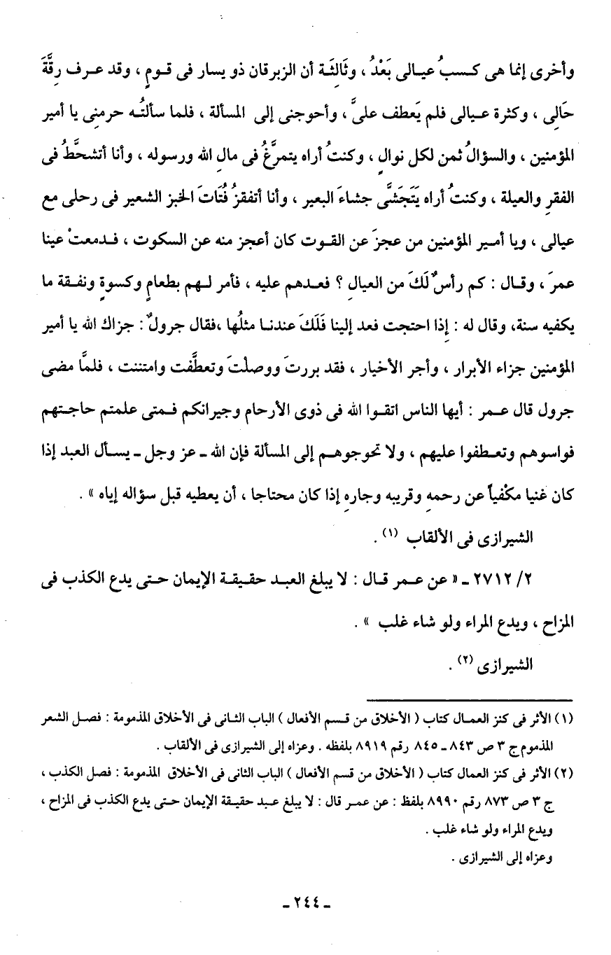 (¬2) الأثر في كنز العمال كتاب (الأخلاق من قسم الأفعال) الباب الثانى في الأخلاق المذمومة: فصل الكذب، جـ 3 ص 873 رقم 8990 بلفظ: عن عمر قال: لا يبلغ عبد حقيقة الإيمان حتى يدع الكذب في المزاح، ويدع المراء ولو شاء غلب.