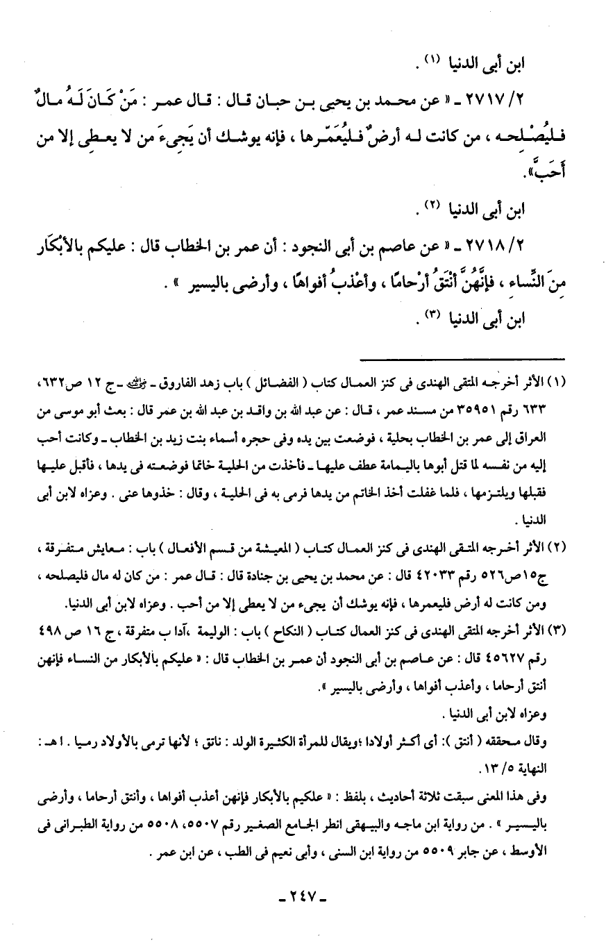 (¬3) الأثر أخرجه المتقى الهندى في كنز العمال كتاب (النكاح) باب: الوليمة، آداب متفرقة، جـ 16 ص 498 رقم 45627 قال: عن عاصم بن أَبى النجود أن عمر بن الخطاب قال: "عليكم بالأبكار من النساء فإنهن أنتق أرحاما، وأعذب أفواها، وأرضى باليسير".