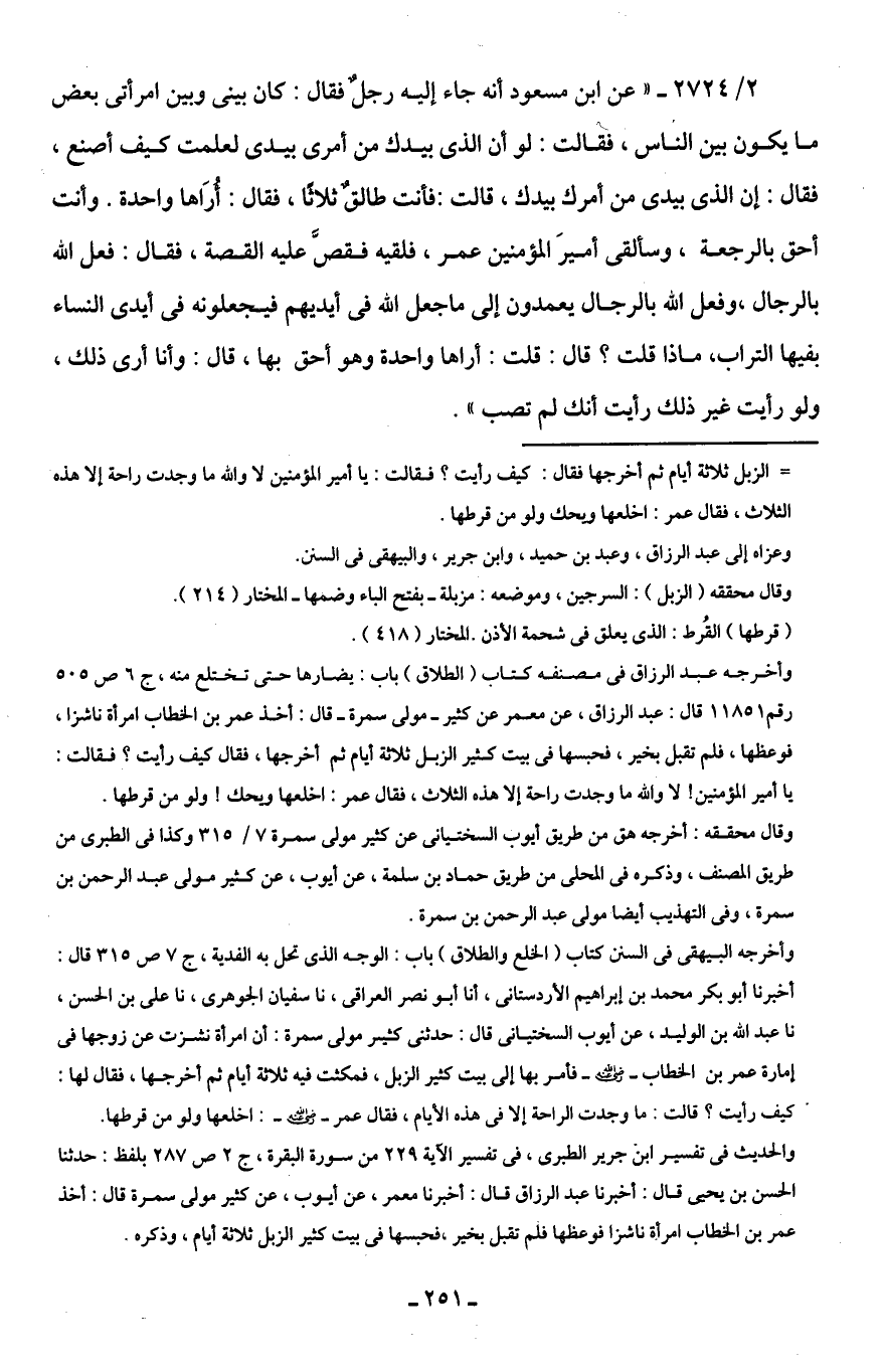 2/ 2724 - "عن ابن مسعود أنه جاء إليه رجلٌ فقال: كان بينى وبين امرأتى بعض ما يكون بين الناس، فقالت: لو أن الذى بيدك من أمرى بيدى لعلمت كيف أصنع، فقال: إن الذى بيدى من أمرك بيدك، قالت: فأنت طالقٌ ثلاثًا، فقال: أُرَاها واحدة. وأنت أحق بالرجعة، وسألقى أميرَ المؤمنين عمر، فلقيه فقصَّ عليه القصة، فقال: فعل اللَّه بالرجال، وفعل اللَّه بالرجال يعمدون إلى ما جعل اللَّه في أيديهم فيجعلونه في أيدى النساء بفيها التراب، ماذا قلت؟ قال: قلت: أراها واحدة وهو أحق بها، قال: وأنا أرى ذلك، ولو رأيت غير ذلك رأيت أنك لم تصب".