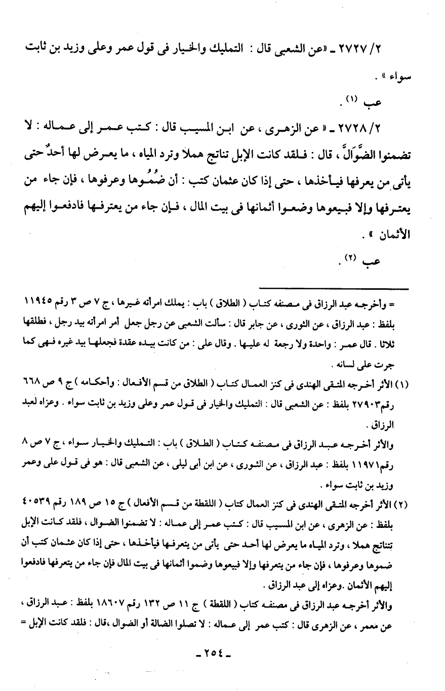 2/ 2728 - "عن الزهرى، عن ابن المسيب قال: كتب عمر إلى عماله: لا تضمنوا الضَّوَالَّ، قال: فلقد كانت الإبل تناتج هملا وترد المياه، ما يعرض لها أحدٌ حتى يأتى من يعرفها فيأخذها، حتى إذا كان عثمان كتب: أن ضُمُوها وعرفوها، فإن جاء من يعترفها وإلا فبيعوها وضعوا أثمانها في بيت المال، فإن جاء من يعترفها فادفعوا إليهم الأثمان".