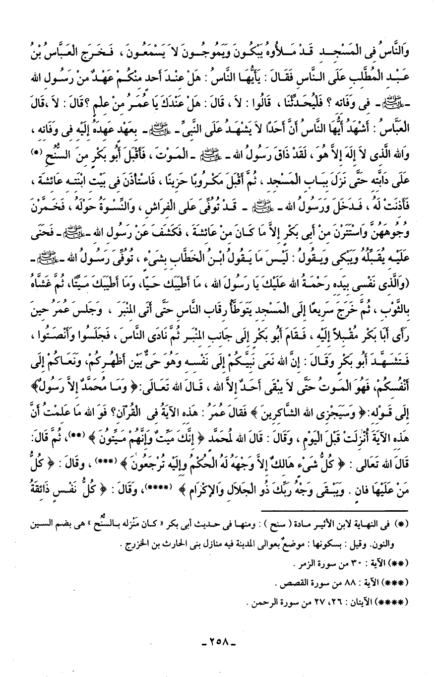 وَالنَّاسُ فِى الْمَسْجِدِ قَدْ مَلأُوهُ يَبْكُونَ وَيَمُوجُونَ لَا يَسْمَعُونَ، فَخَرَج الْعَبَّاسُ بْنُ عَبْد الْمُطَّلِبِ عَلَى النَّاسِ فَقَالَ: يَا أَيُّهَا النَّاسُ: هَلْ عِنْدَ أَحدٍ مِنْكُمْ عَهْدٌ منْ رَسُولِ اللَّه -صلى اللَّه عليه وسلم- فِى وَفَاته؟ فَليُحَدِّثَنَا، قَالُوا: لَا، قَالَ: هَلْ عَنْدَكَ يَا عُمَرُ مِنْ عِلْمٍ؟ قَالَ: لَا، قَالَ الْعَبَّاسُ: أَشْهَدُ أَيُّهَا النَّاسُ أَنَّ أَحَدًا لَا يَشْهَدُ عَلَى النَّبِىِّ -صلى اللَّه عليه وسلم- بِعَهْدٍ عَهِدَهُ إِلَيْهِ فِى وَفَاتِهِ، وَاللَّه الَّذى لَا إِلَهَ إِلَّا هُوَ، لَقَدْ ذَاقَ رَسُولُ اللَّه -صلى اللَّه عليه وسلم- الْمَوْتَ، فَأَقْبَلَ أَبُو بَكْرٍ مِنَ السُّنُحِ (*) عَلَى دَابَّتِهِ حَتَّى نَزَلَ بِبَابِ الْمَسْجِدِ، ثُمَّ أَقْبَلَ مَكْرُوبًا حَزِينًا، فَاسْتأْذَنَ فِى بَيْتِ ابْنَتِهِ عَائِشَة، فَأَذِنَتْ لَهُ، فَدَخَلَ وَرَسُولُ اللَّه -صلى اللَّه عليه وسلم- قَدْ تُوُفَى عَلى الْفِرَاشِ، وَالنِّسْوَةُ حَوْلَهُ، فَخَفَرْنَ وُجُوهَهُن وَاسْتَتَرْنَ مِنْ أَبِى بَكْرٍ إِلَّا مَا كَانَ مِنْ عَائِشَةَ، فَكَشَفَ عَنْ رَسُولِ اللَّهِ -صلى اللَّه عليه وسلم- فَحَنَى عَلَيْهِ يُقَبِّلُهُ وَيَبْكِى وَيقُولُ: لَيْسَ مَا يَقُولُ ابْنُ الْخَطَّابِ بشَئٍ، تُوُفِّى رَسُولُ اللَّه -صلى اللَّه عليه وسلم- (وَالَّذِى نَفْسِى بِيَدِهِ رَحْمَةُ اللَّه عَلَيْكَ يَا رَسُولَ اللَّه، مَا أَطْيَبَكَ حَيًّا، وَمَا أَطْيَبَكَ مَيِّتًا، ثُمَّ غَشَّاهُ بِالثَّوْبِ، ثُمَّ خَرَجَ سَرِيعًا إِلَى الْمَسْجِدِ يَتَوَطَّأُ رِقَاب النَّاسِ حَتَّى أَتَى المِنْبَرَ، وَجَلسَ عُمَرُ حِينَ رَأَى أَبَا بَكْر مُقْبِلًا إِلَيهِ، فَقَامَ أَبُو بَكْرٍ إِلَى جَانِبِ المِنْبَر ثُمَّ نَادَى النَّاسَ، فَجَلَسُوا وَأَنْصَتُوا، فَتَشَهَّدَ أَبُو بَكْرٍ وَقَالَ: إِنَّ اللَّه نَعَى نَبِيَّكُمْ إِلَى نَفْسِهِ وَهُوَ حَىٌّ بَيْن أَظهُرِكُمْ، وَنَعَاكُمْ إِلَى أَنْفُسِكُمْ، فَهُوَ الْمَوتُ حَتَّى لَا يبْقَى أَحَدٌ إِلَّا اللَّه، قَالَ اللَّه تَعَالَى: {وَمَا مُحَمَّدٌ إِلَّا رَسُولٌ} إِلَى قَوْلِهِ: {وَسَيَجْزِى اللَّهُ الشَّاكِرِينَ} فَقالَ عُمَرُ: هَذهِ الآيَةُ فِى الْقُرْآنِ؟ فَوَاللَّه مَا عَلِمْتُ أَنَّ هَذِهِ الآيَةَ أُنزِلَتْ قَبْلَ الْيَوْمِ، وَقَالَ: قَالَ اللَّه لمُحَمَّد {إِنَّكَ مَيِّتٌ وَإِنَّهُمْ مَيِّتُونَ} (* *)، ثُمَّ قَالَ: قَالَ اللَّه تَعَالى: {كُلُّ شَيْءٍ هَالِكٌ إِلَّا وَجْهَهُ لَهُ الْحُكْمُ وَإِلَيْهِ تُرْجَعُونَ} (* * *)، وقَالَ: {كُلُّ مَنْ عَلَيْهَا فَانٍ (26) وَيَبْقَى وَجْهُ رَبِّكَ ذُو الْجَلَالِ وَالْإِكْرَامِ} (* * * *)، وَقَالَ: {كُلُّ نَفْسٍ ذَائِقَةُ