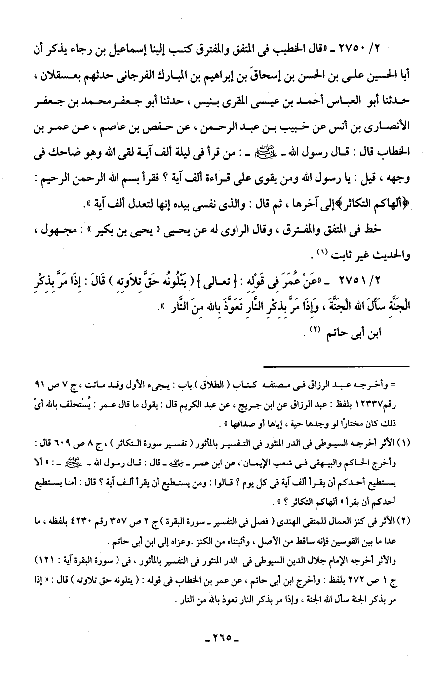 2/ 2750 - "قال الخطيب في المتفق والمفترق كتب إلينا إسماعيل بن رجاء يذكر أن أبا الحسين على بن الحسن بن إسحاقَ بن إبراهيم بن المبارك الفرجانى حدثهم بعسقلان، حدثنا أبو العباس أحمد بن عيسى المقرى بنيس، حدثنا أبو جعفر محمد بن جعفر الأنصارى بن أَنس عن خبيب بن عبد الرحمن، عن حفص بن عاصم، عن عمر بن الخطاب قال: قال رسول اللَّه -صلى اللَّه عليه وسلم-: من قرأ في ليلة ألف آية لقى اللَّه وهو ضاحك في وجهه، قيل: يا رسول اللَّه ومن يقوى على قراءة ألف آية؟ فقرأ بِسْمِ اللَّهِ الرَّحْمَنِ الرَّحِيمِ: {أَلْهَاكُمُ التَّكَاثُرُ} إلى آخرها، ثم قال: والذى نفسى بيده إنها لتعدل ألف آية".
