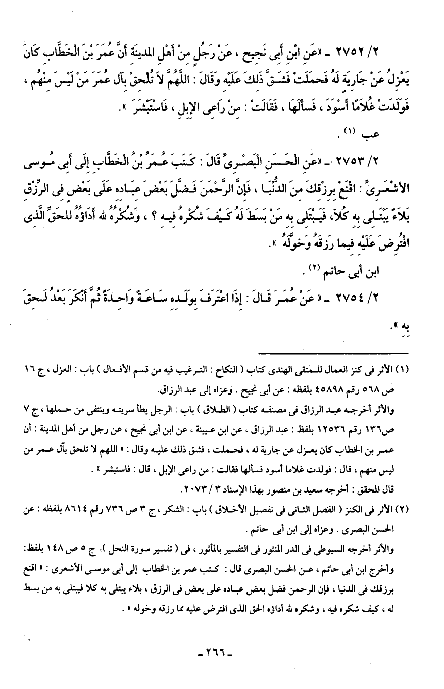 2/ 2752 - "عَنِ ابْنِ أَبِى نَجِيح، عَنْ رَجُلٍ مِنْ أَهْلِ المدينَةِ أَنَّ عُمَرَ بْنَ الْخَطَّابِ كَانَ يَعْزِلُ عَنْ جَارِيَة لَهُ فَحمَلَتْ فَشَقَّ ذَلِكَ عَلَيْهِ وَقَالَ: اللَّهُمَّ لَا تُلحِقْ بِآل عُمَرَ مَنْ لَيْسَ مِنْهُم، فَوَلَدَتْ غُلَامًا أَسْوَدَ، فَسأَلَهَا، فَقَالَتْ: مِنْ رَاعِى الإِبِلِ، فَاسْتَبْشَرَ".