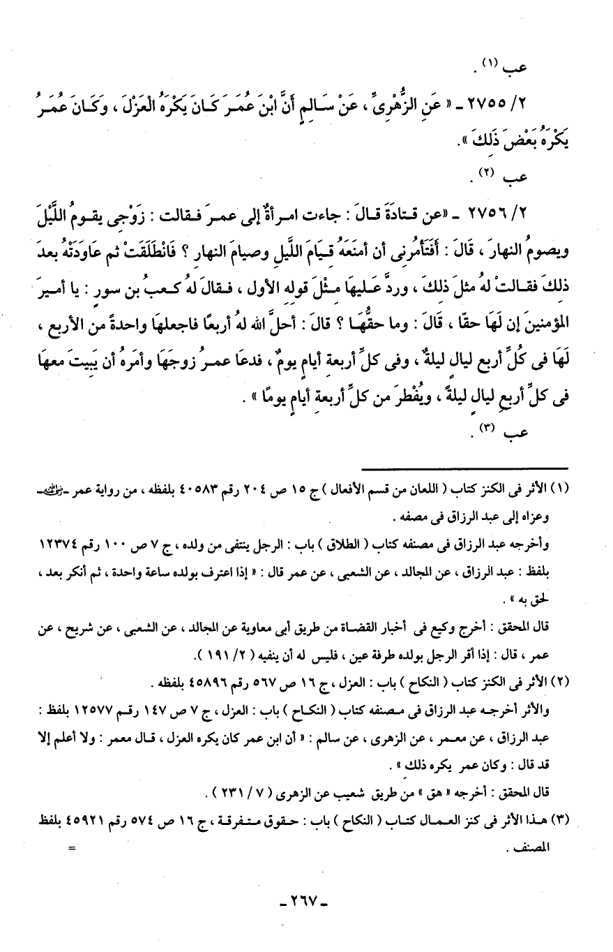 2/ 2755 - "عَنِ الزُّهرِىِّ، عَنْ سالِمٍ أَنَّ ابْنَ عُمَرَ كَانَ يَكْرَهُ الْعَزْل، وَكَانَ عُمَرُ يَكْرَهُ بَعْضَ ذَلِكَ".