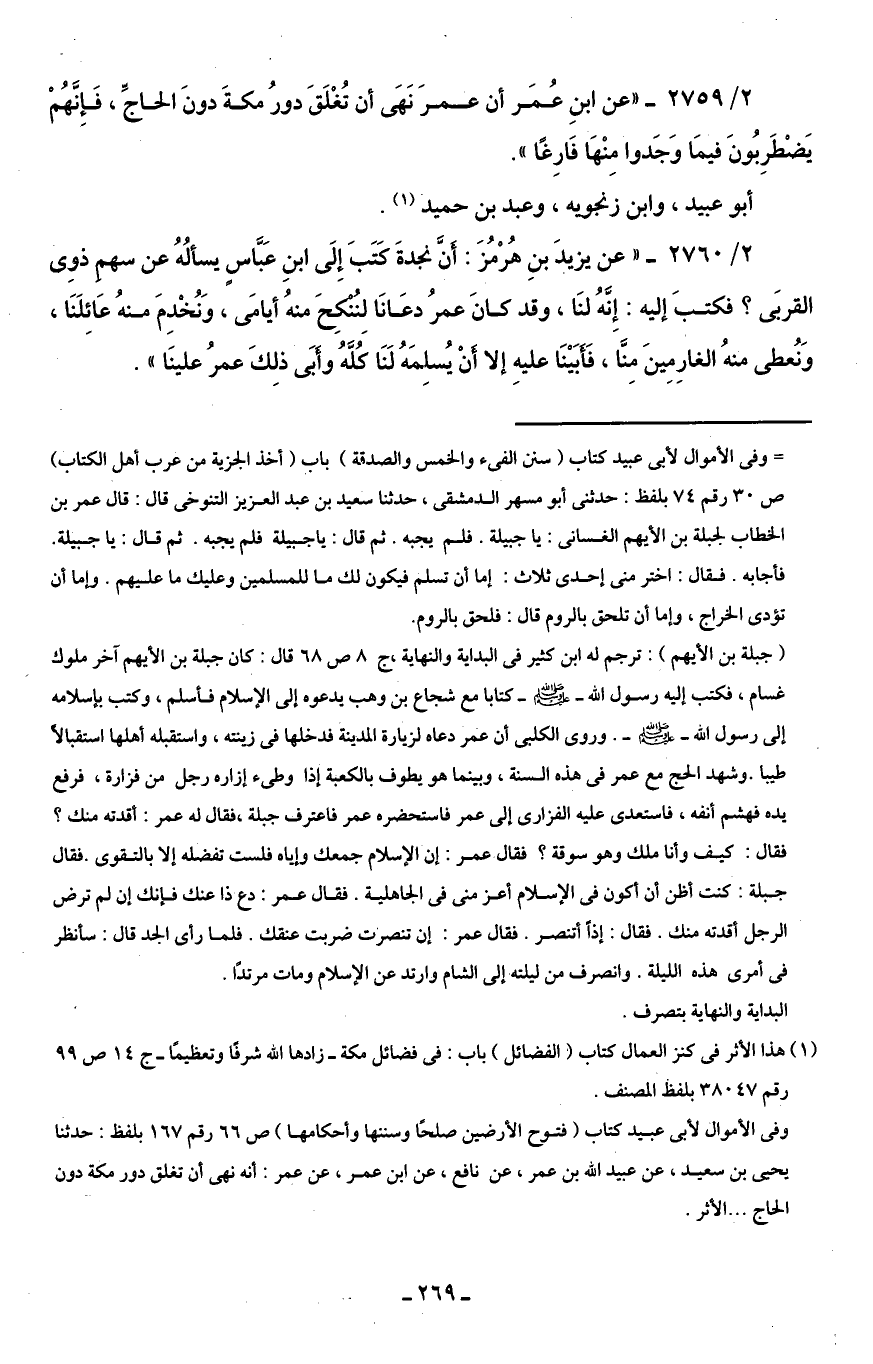 وفى الأموال لأبى عبيد كتاب (فتوح الأرضين صلحًا وسننها وأحكامها) ص 66 رقم 167 بلفظ: حدثنا يحيى بن سعيد، عن عبيد اللَّه بن عمر، عن نافع، عن ابن عمر، عن عمر: أنه نهى أن تغلق دور مكة دون الحاج. . . الأثر.