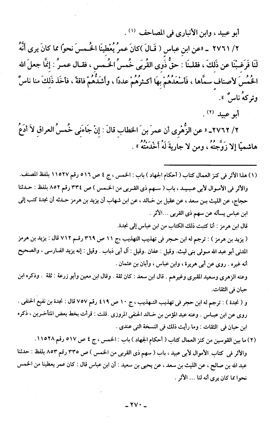 (¬1) هذا الأثر في كنز العمال كتاب (أحكام الجهاد) باب: الخمس، جـ 4 ص 516 رقم 11527 بلفظ المصنف.